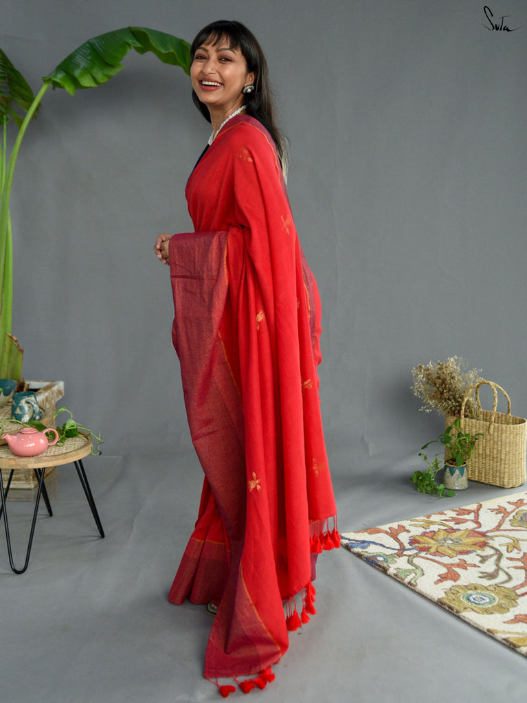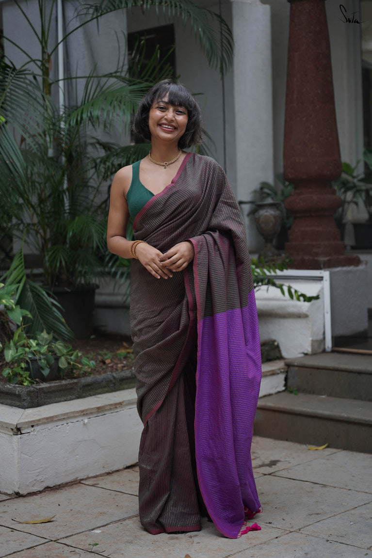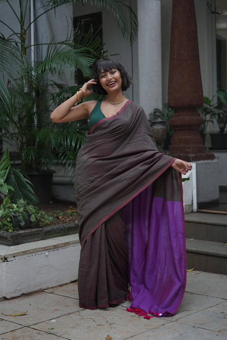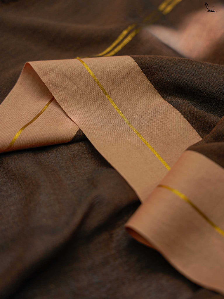 Earthy and comfortable, Dal Chini blends deep brown hues with a subtle zari border for a refined look. The beige jhalar tassels add softness to the rich woven mul cotton drape. A versatile choice for formal day events or understated festive occasions.