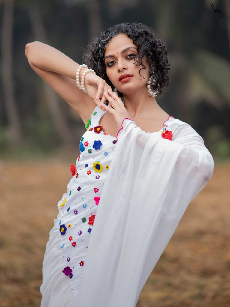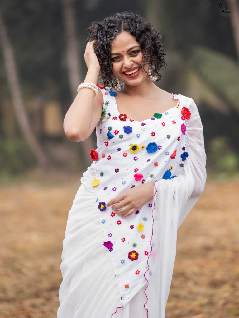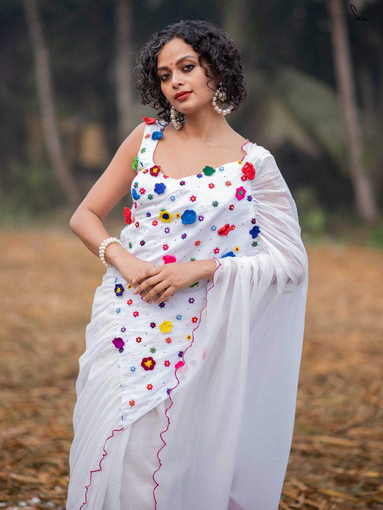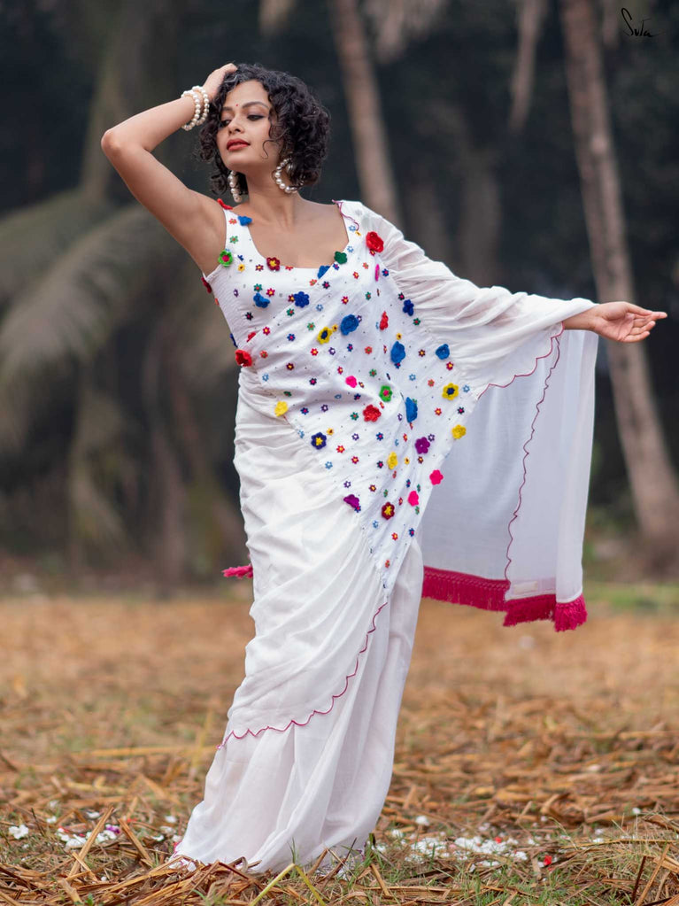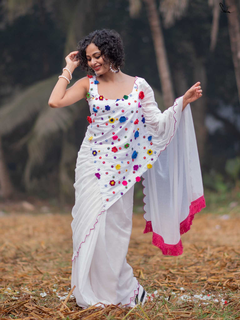This saree is a canvas of joy, painted with a thousand colors of Holi. The white Mul Modal saree flows like a swirl of vibrant gulaal, carrying with it the spirit of celebration. Each fold is a splash of freedom hand-stitched in rich 3D multicolor crochet flowers and hand-embroidered sequin. The detailed scallop finish all-over twirls with the wind, while jhalar tassels add a hint of whimsy like the dance of colors in the air. Complement with a gathered pallu, it spreads a perfect festive joy and is bold enough to carry the spirit of every Holi reveler.