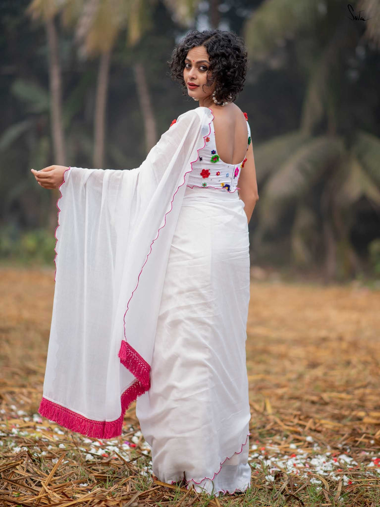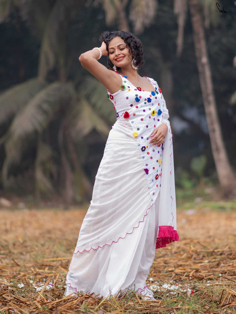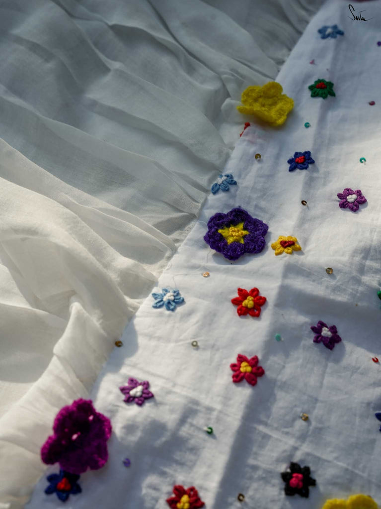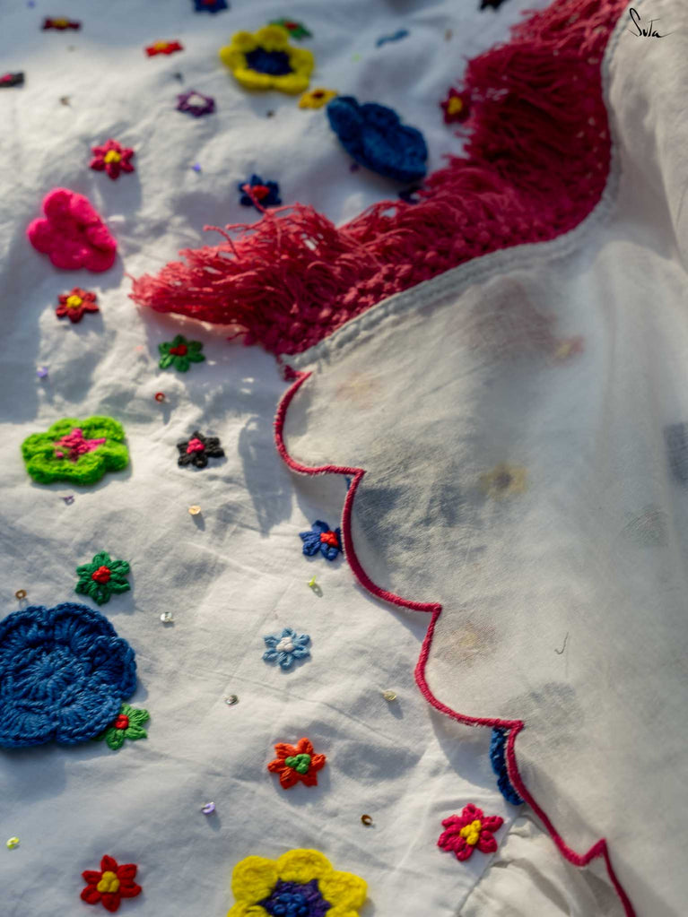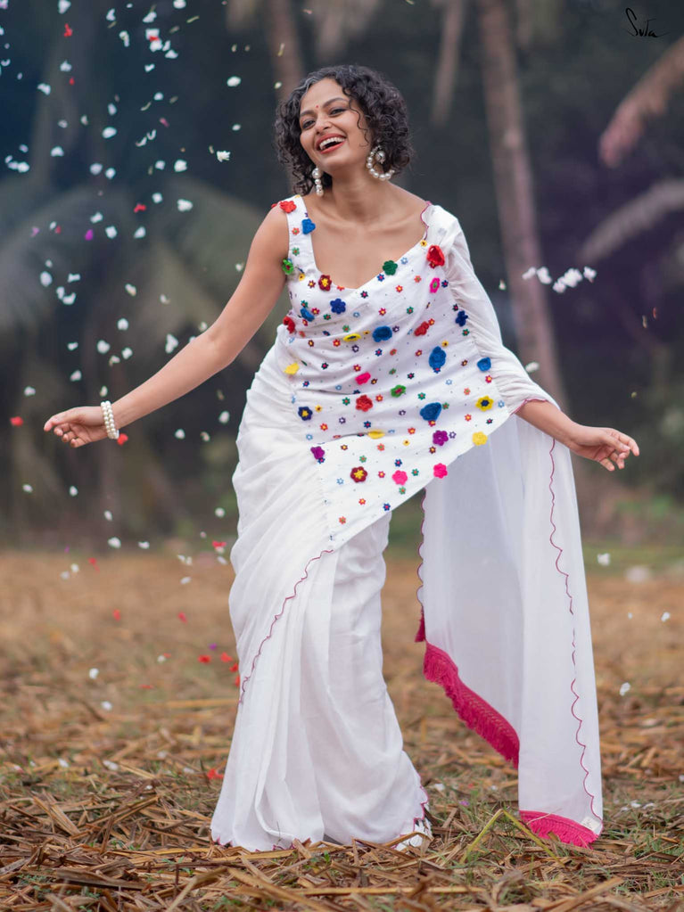 This saree is a canvas of joy, painted with a thousand colors of Holi. The white Mul Modal saree flows like a swirl of vibrant gulaal, carrying with it the spirit of celebration. Each fold is a splash of freedom hand-stitched in rich 3D multicolor crochet flowers and hand-embroidered sequin. The detailed scallop finish all-over twirls with the wind, while jhalar tassels add a hint of whimsy like the dance of colors in the air. Complement with a gathered pallu, it spreads a perfect festive joy and is bold enough to carry the spirit of every Holi reveler.