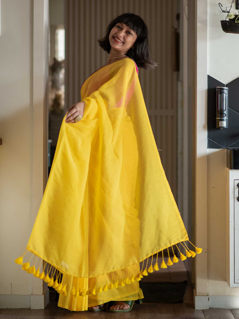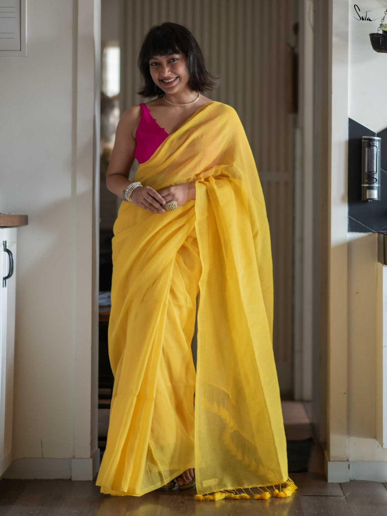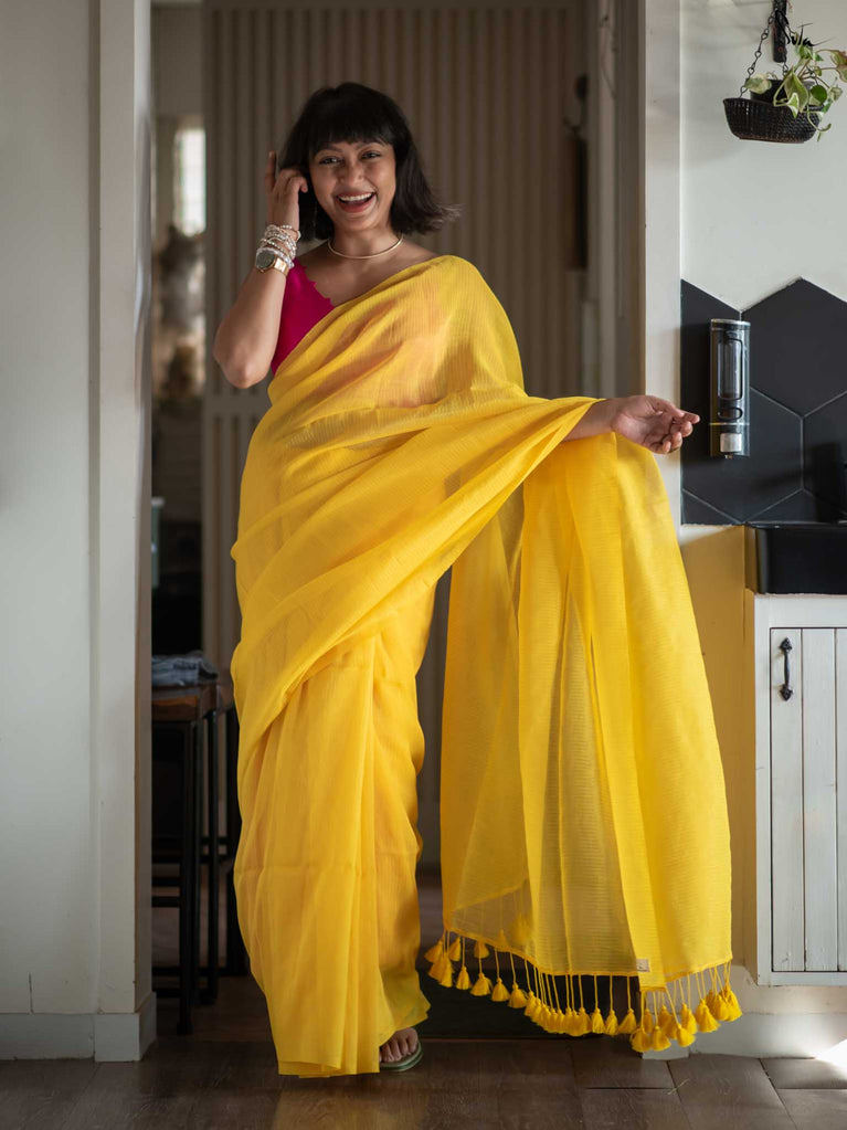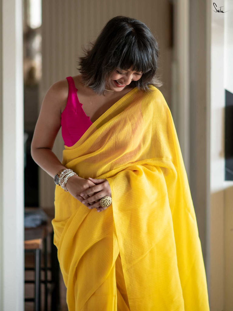 Bright and cheerful, this yellow mul cotton saree comes alive with its delicate zari stripes that catch and reflect light beautifully. The airy fabric is as comfortable as it is stylish, making it a great pick for celebrations or daytime events. Style it with a contrast Suta blouse and dainty earrings for an effortless yet striking appearance.