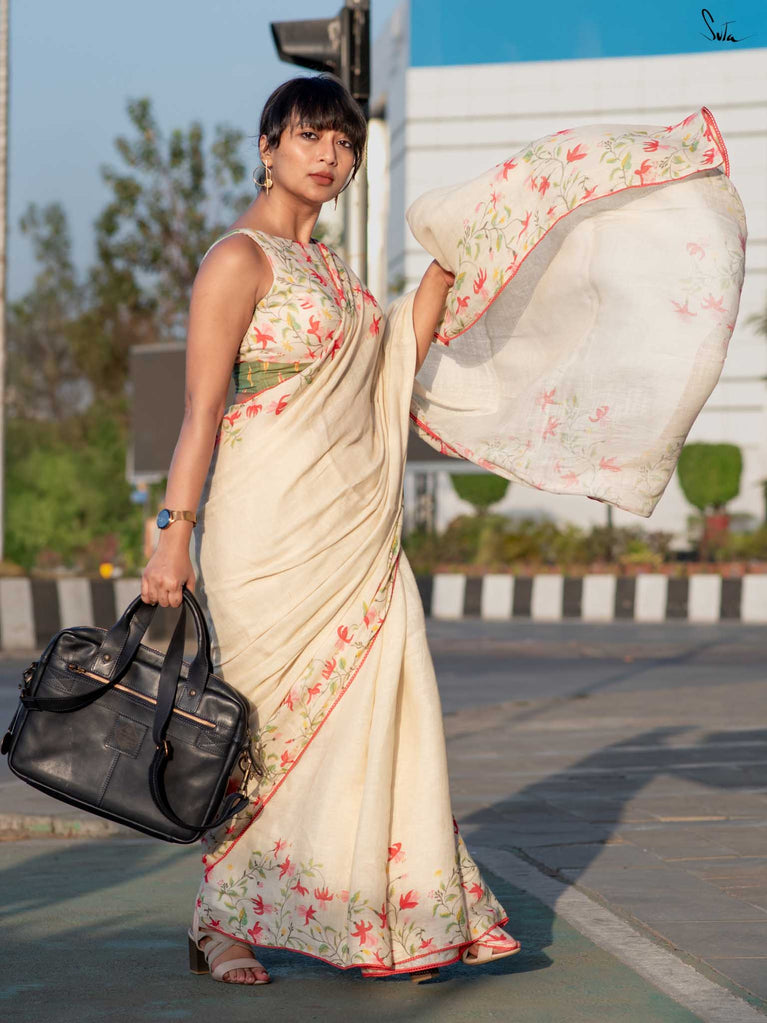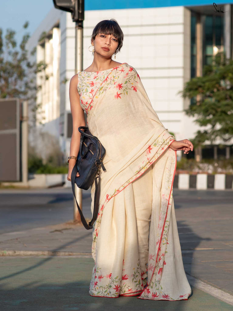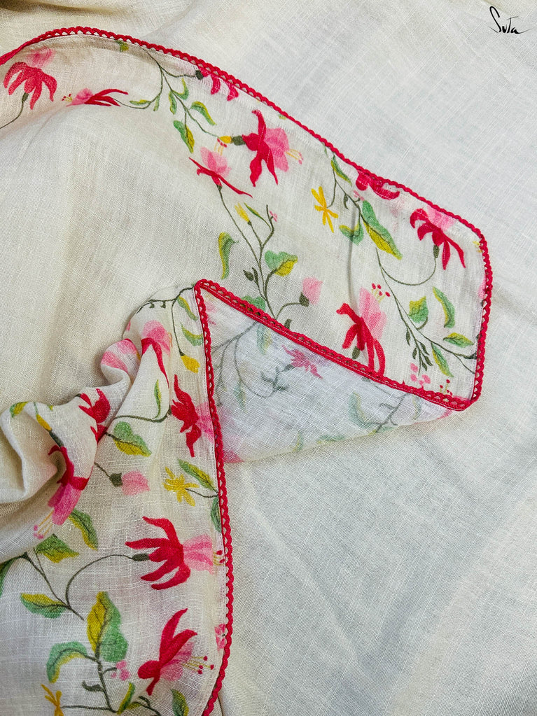 Unfold into grace with Fuchsia Fiza, a lovely off-white cotton linen saree that radiates warmth and beauty. The enchanting fuchsia border, paired with pink scalloped lace, evokes the gentle elegance of blooming flowers, making you feel as beautiful as you look. As you drape this stunning saree, its serene charm adds an aura of calm and refined elegance to your style. Pair it with the Phool blouse for a confident and effortlessly chic look that exudes sophistication.