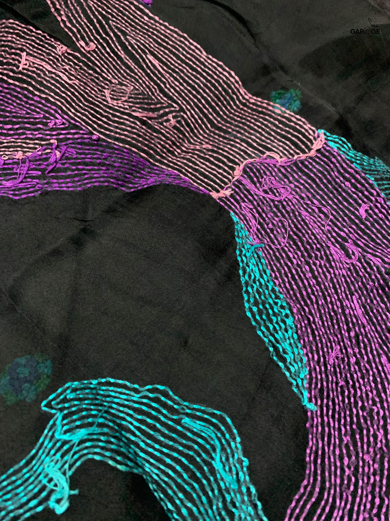 Kantha is traditional art that originated right in the heart of loving households of the Bengal region where the industrious women upcycled fabric bits into quilts, blankets and clothing by stitching them together and then crafted beautiful embroidery patterns across the kaleidoscope of fabrics. The artisans use spectacular motifs and delicate stitching techniques to create stunning art.