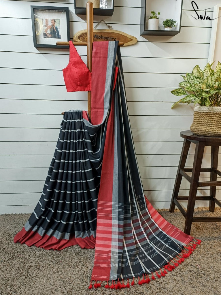 A lightweight, figure-flattering saree that’s made of pure cotton is just what your wardrobe ordered. The red-tinged floral accents on a background of the deepest navy blue make this saree truly memorable.