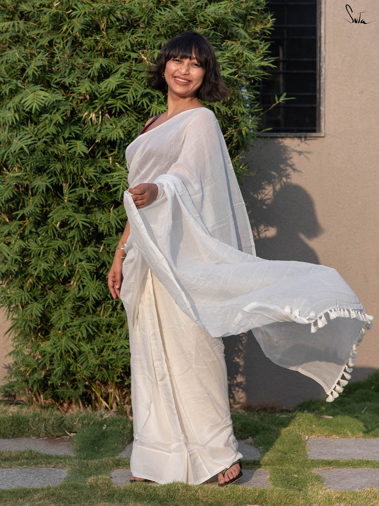 Pure, soft, and melt-in-your-heart beautiful. This white mul modal saree feels like a sweet memory in motion. Light, luminous, and lovely for any moment you want to keep close. With a cosy lining and a handy pocket, this ready-to-wear wonder wraps you in elegance with zero effort.