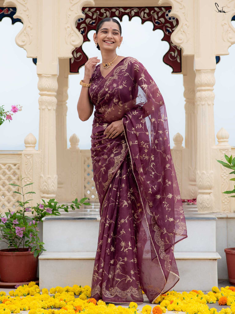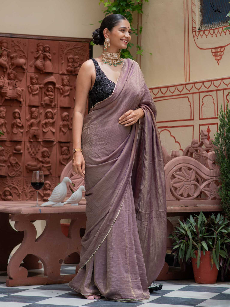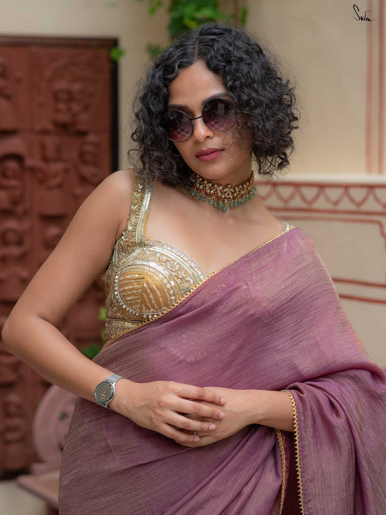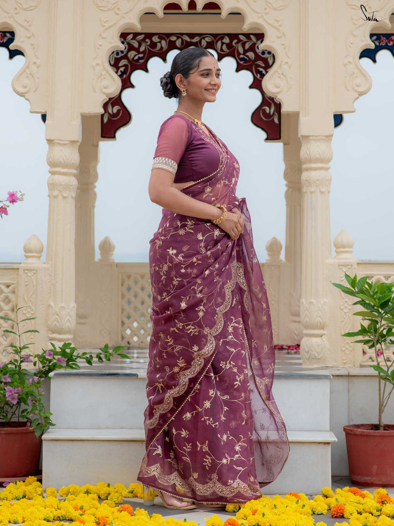 Make every celebration sparkle with Berry Foil, a sheer, lightweight organza saree in elegant mauve. Delicate golden foil prints shimmer across the drape, complemented by intricate scallop-edge detailing for a refined, chic finish.