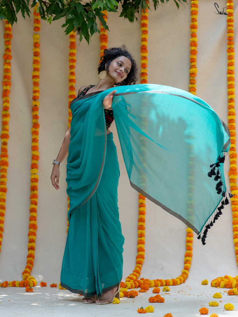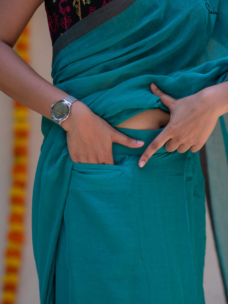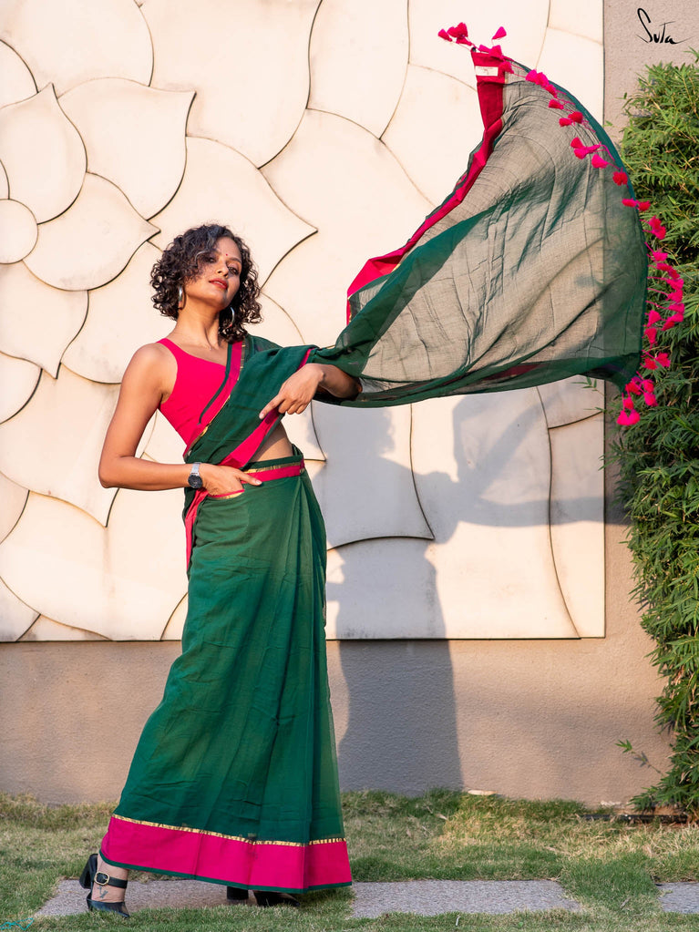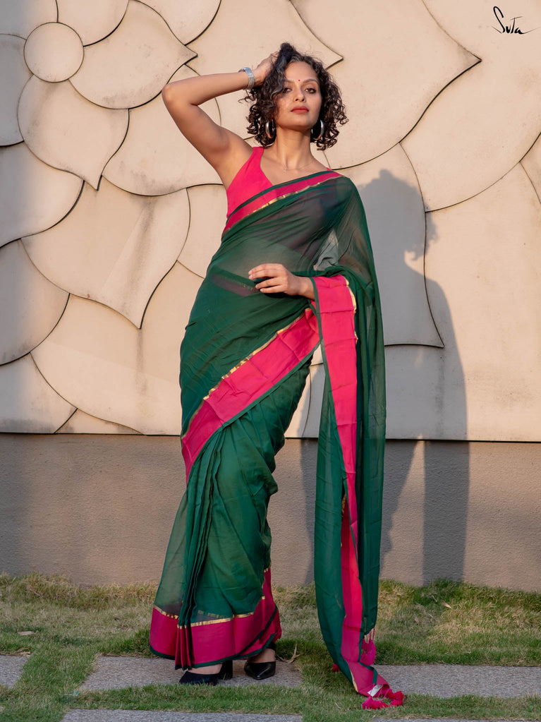 A blend of nature’s calm and vibrant charm, this green mul cotton saree is a breath of fresh air. With a delicate pink border that adds a playful yet sophisticated touch, it’s the perfect harmony of elegance and ease. Designed to wrap you in comfort, this ready-to-wear saree comes with a soft lining and a secret pocket, making it the ultimate fusion of style and practicality. Whether you're attending a day gathering or a casual celebration, Betul effortlessly brings grace to every occasion.