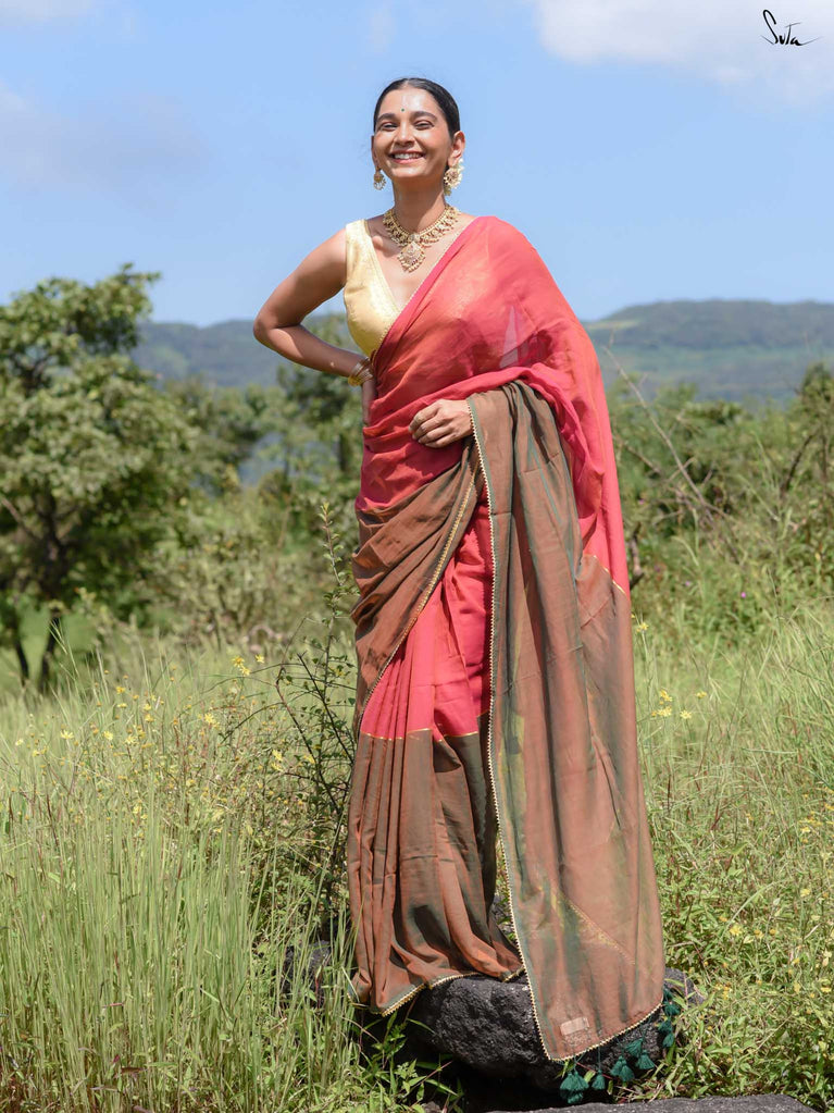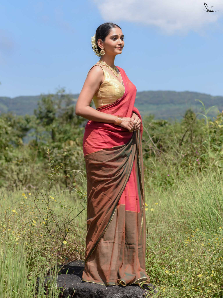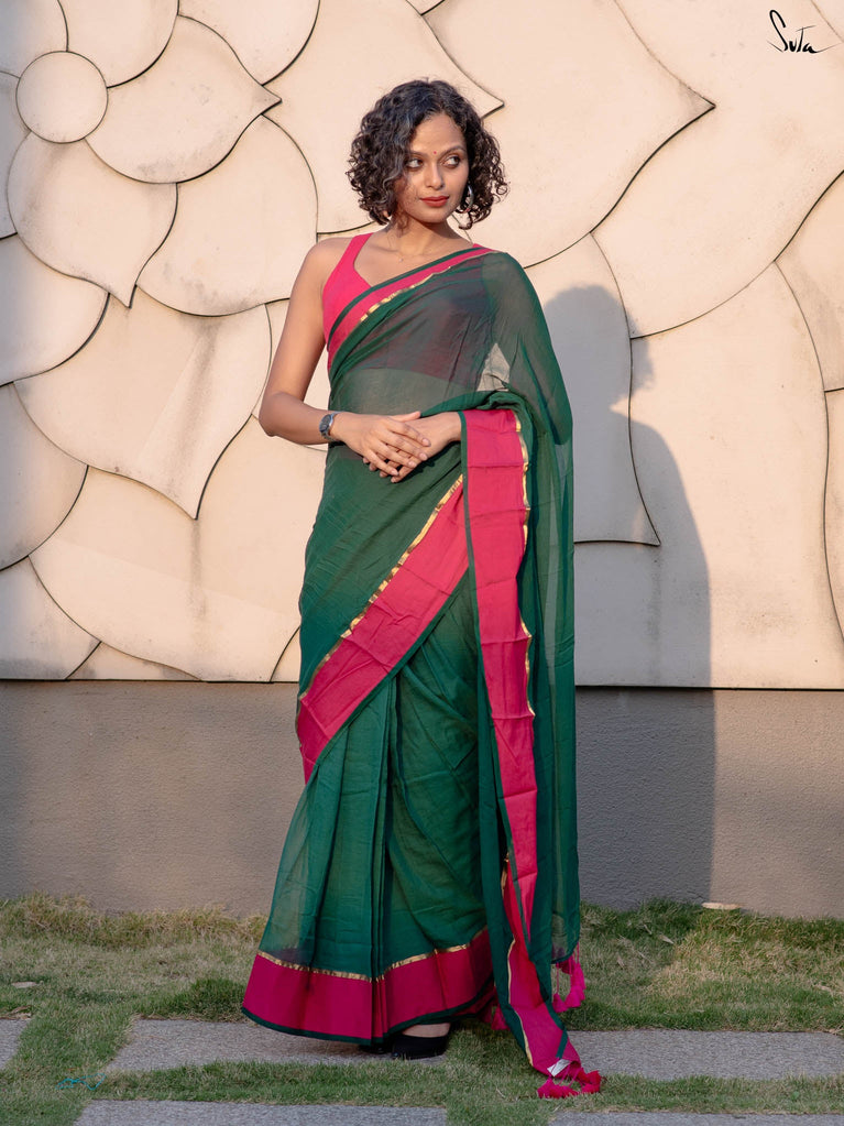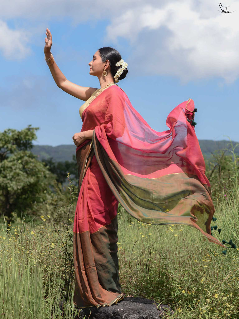 Celebrate vibrant contrasts with Dipped in Gulaab, a mul cotton saree that brings together pink and green in a striking half-and-half design. The center is highlighted with a delicate zari stripe, adding a subtle shimmer that enhances the elegance of the drape. Woven with care, this saree combines artisanal craftsmanship with everyday comfort, making it perfect for festive occasions or wedding celebrations.