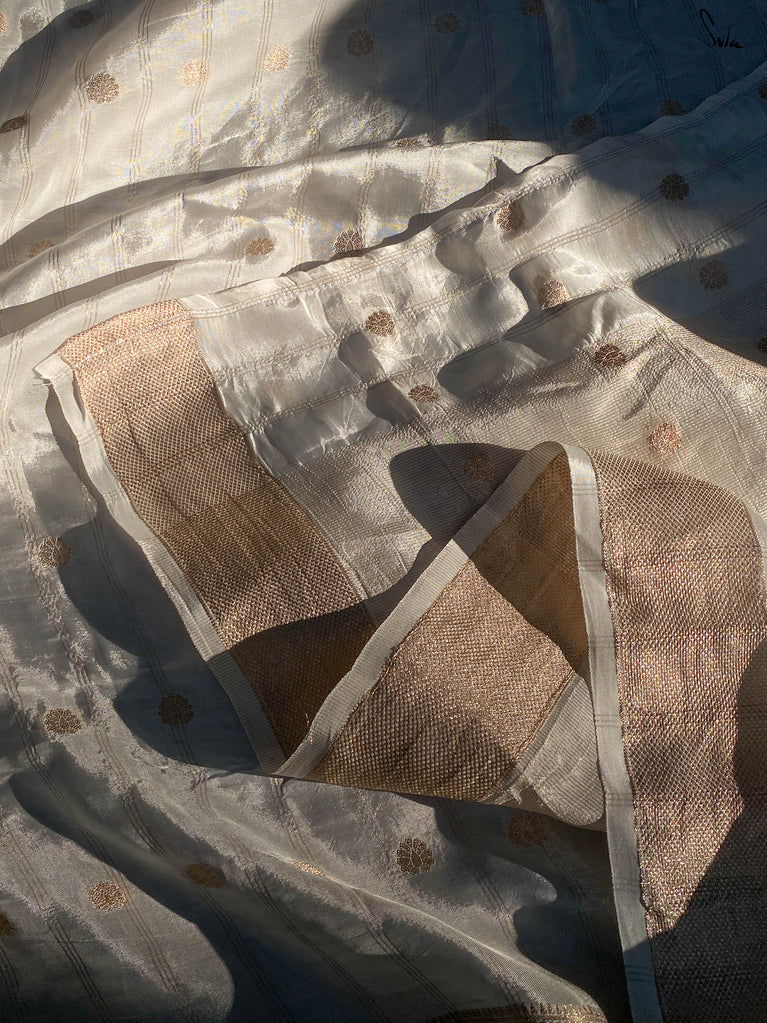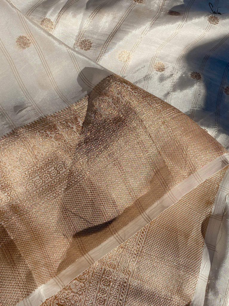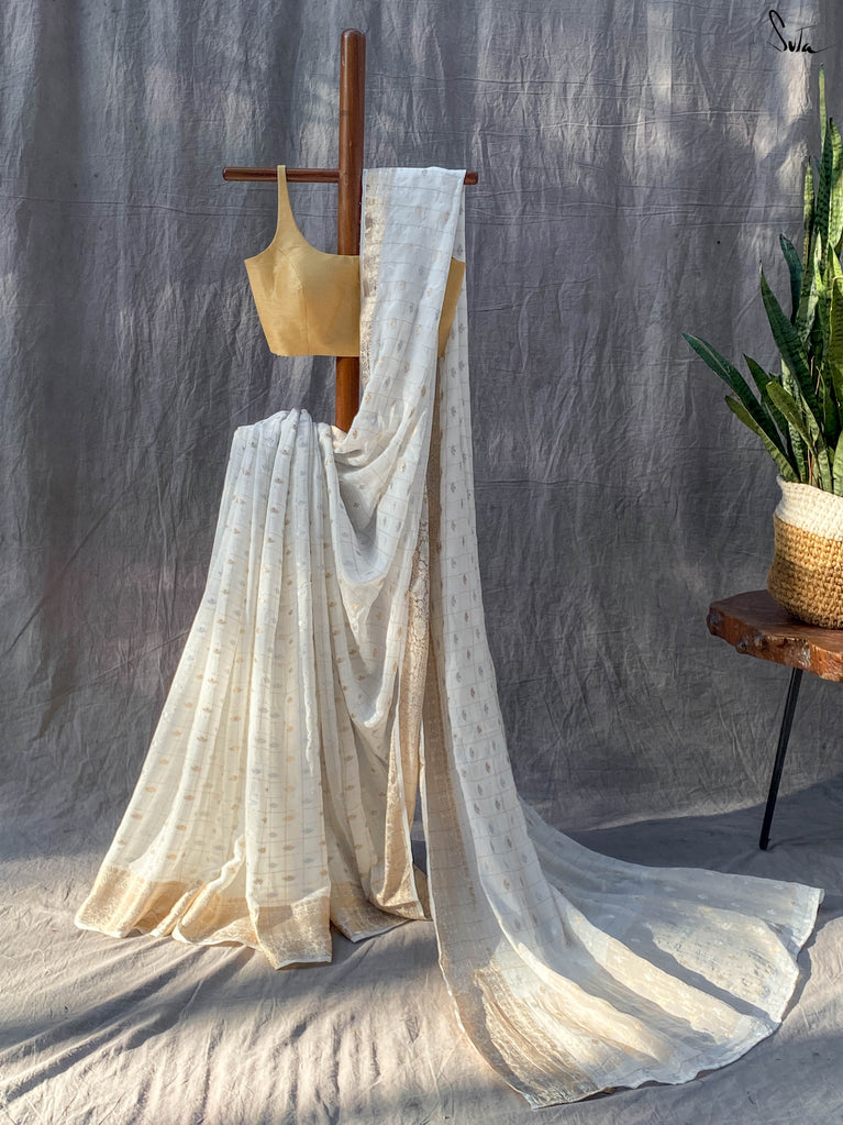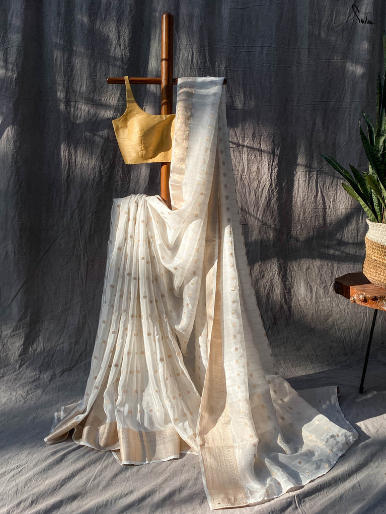 Dharani, a soulful saree made from delicate mul cotton, features a white and gold color scheme with a plain gold border that adds a touch of luxury. Adjustable loops, a small pocket, and matching lining ensure a perfect drape, making it ideal for any occasion in under 30 seconds.