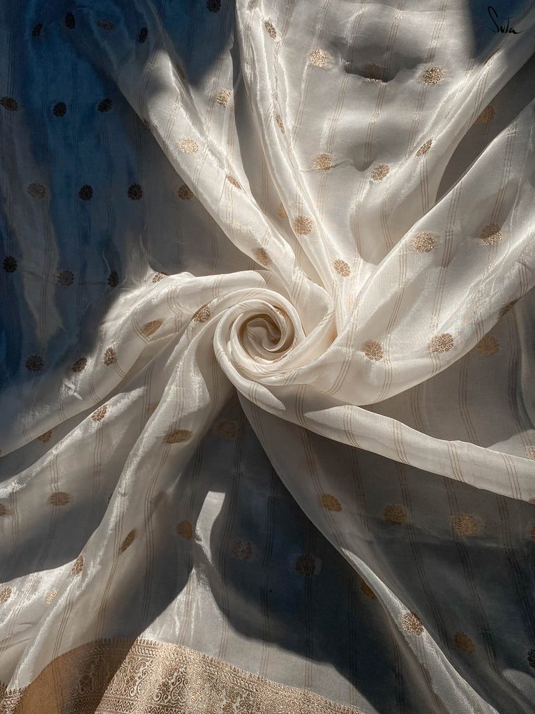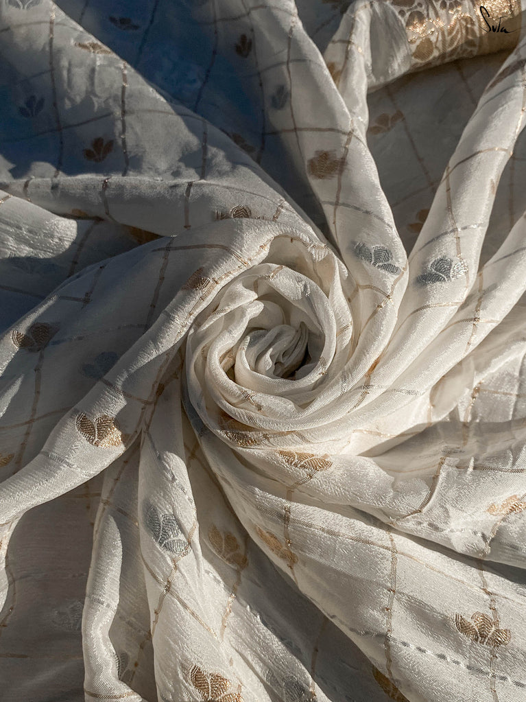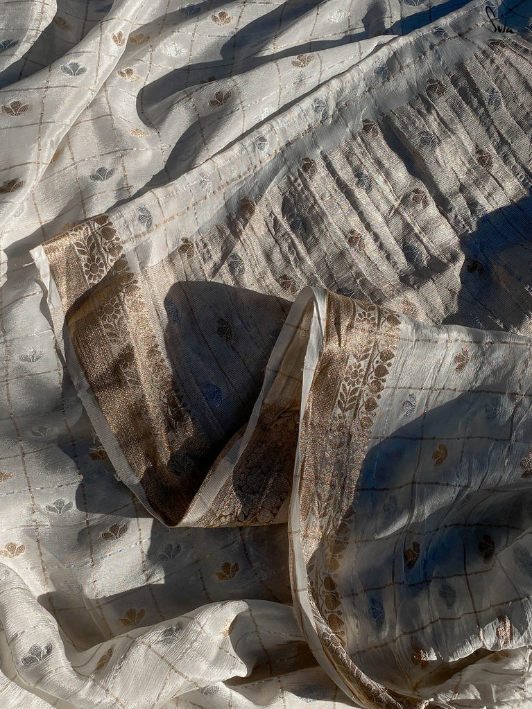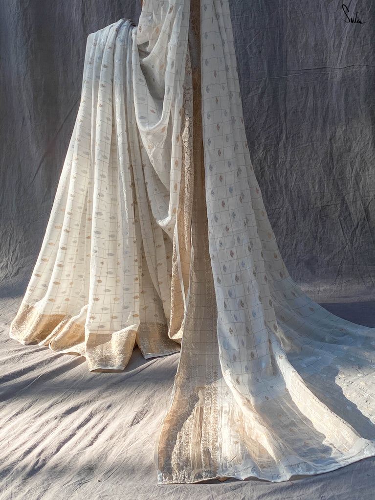 Dharani, a soulful saree made from delicate mul cotton, features a white and gold color scheme with a plain gold border that adds a touch of luxury. Adjustable loops, a small pocket, and matching lining ensure a perfect drape, making it ideal for any occasion in under 30 seconds.