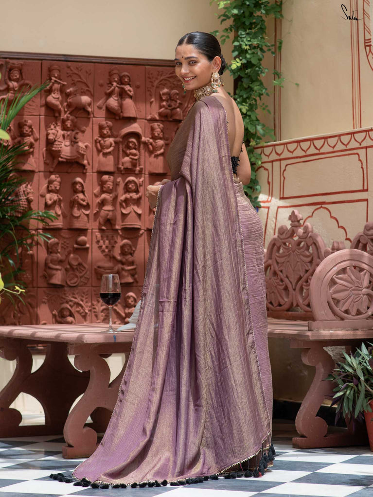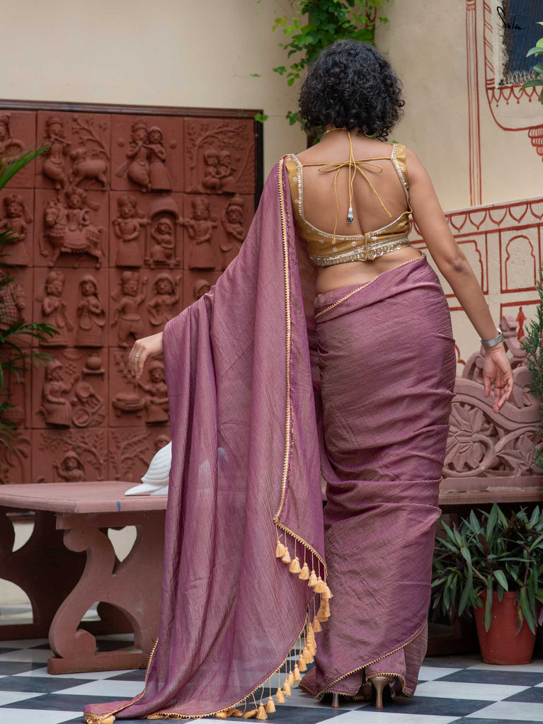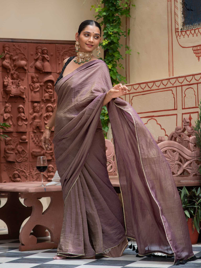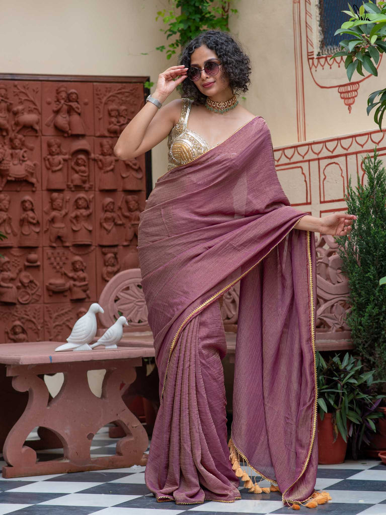 Soft never looked this stunning. This mauve crushed viscose saree carries a hush of romance with a streak of fire. The contrast tassels and gota border add to this personality.