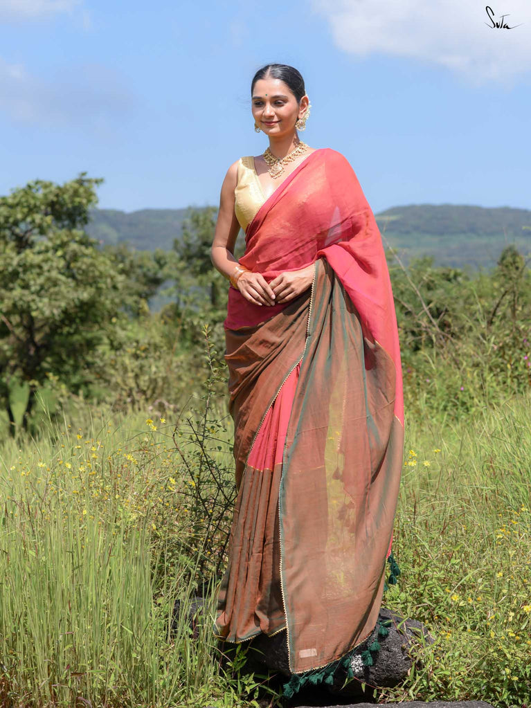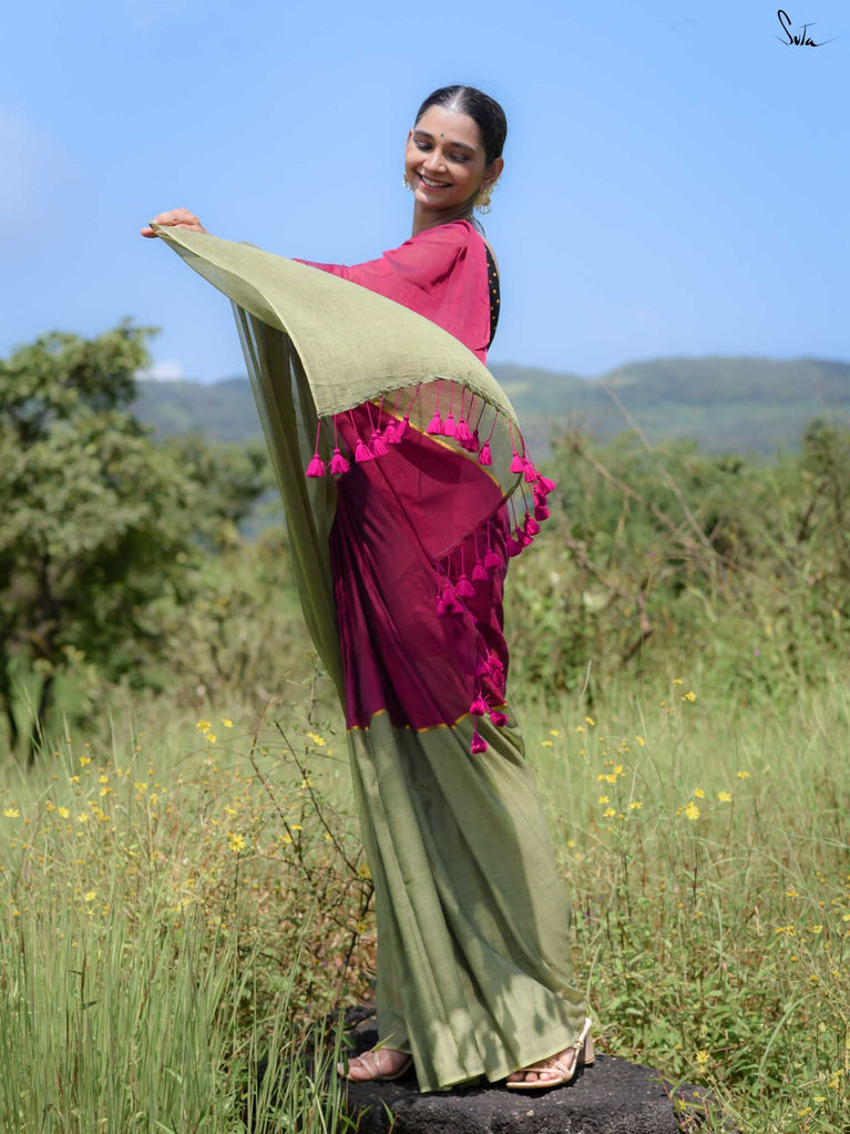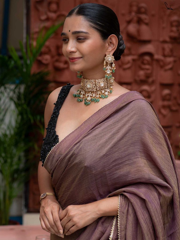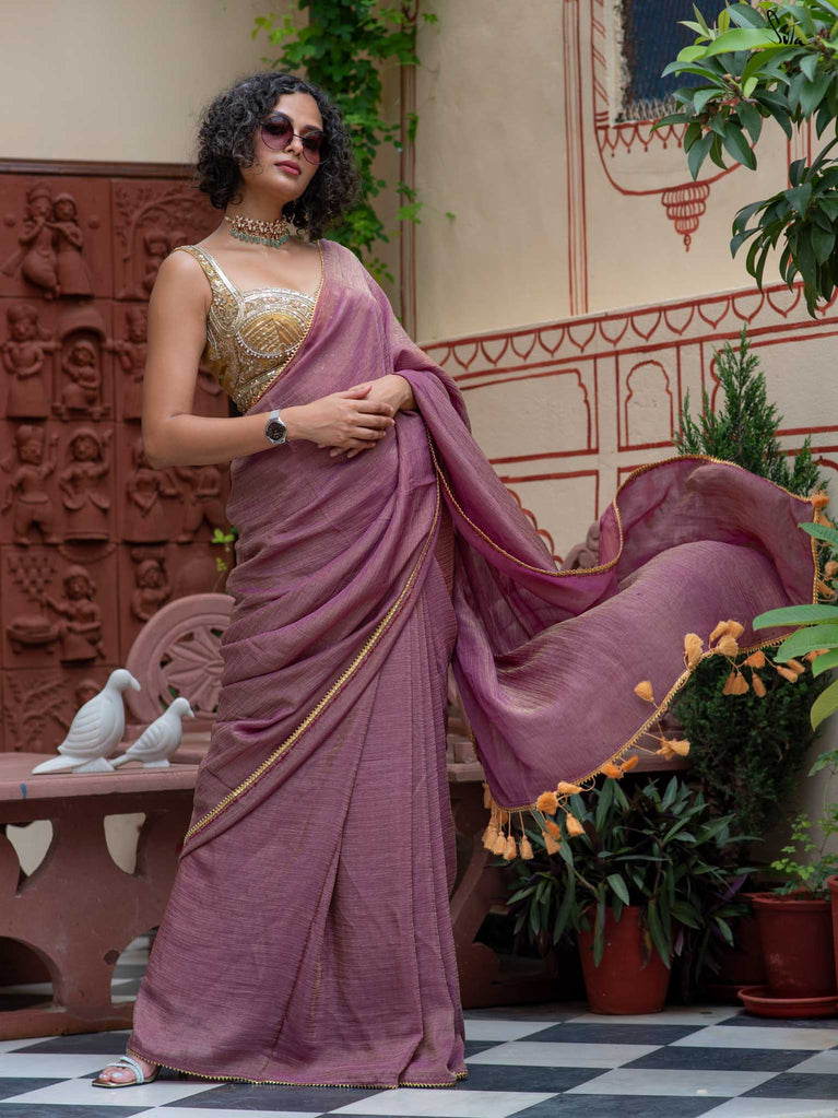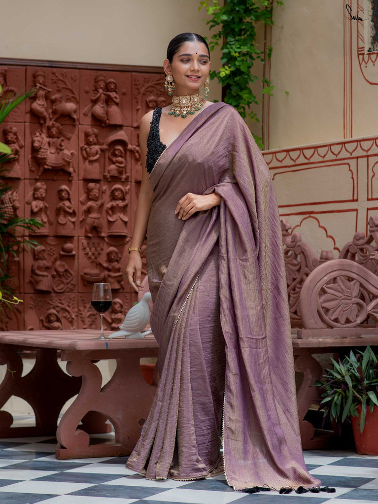 Soft never looked this stunning. This mauve crushed viscose saree carries a hush of romance with a streak of fire. The contrast tassels and gota border add to this personality.