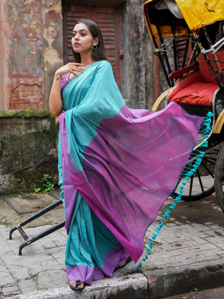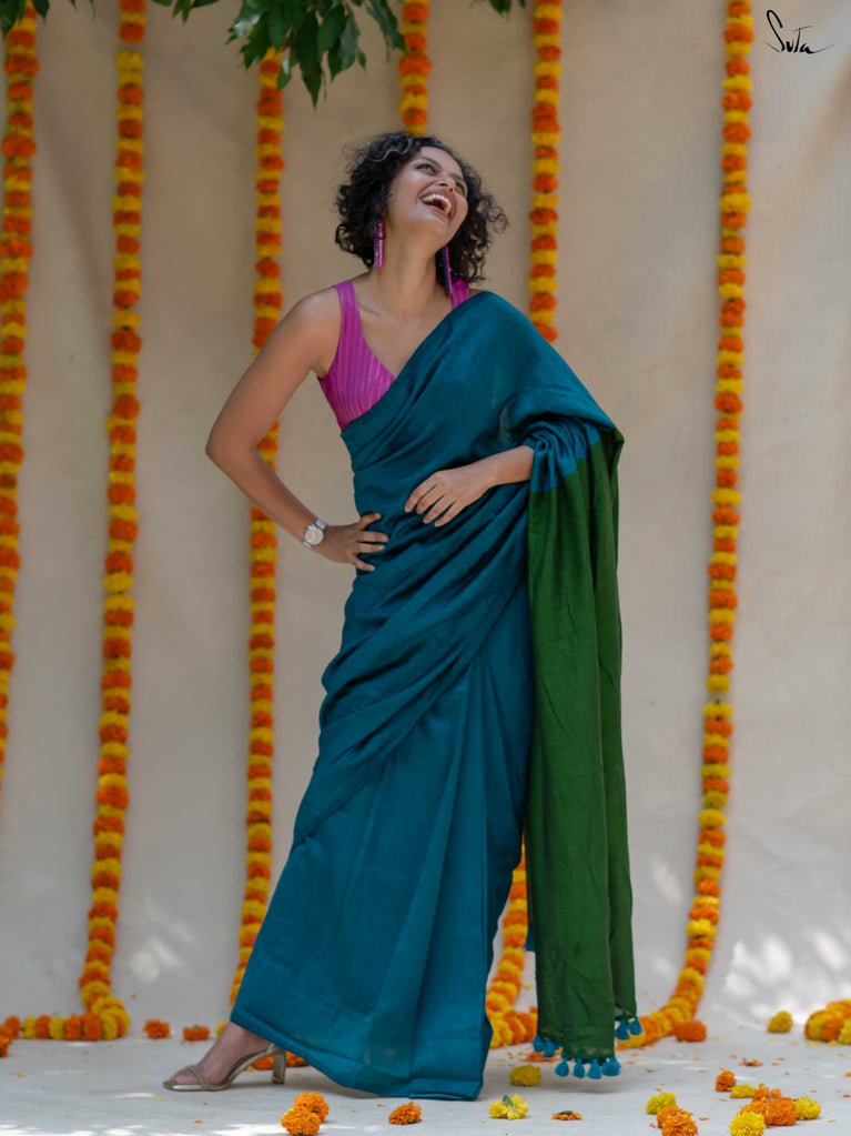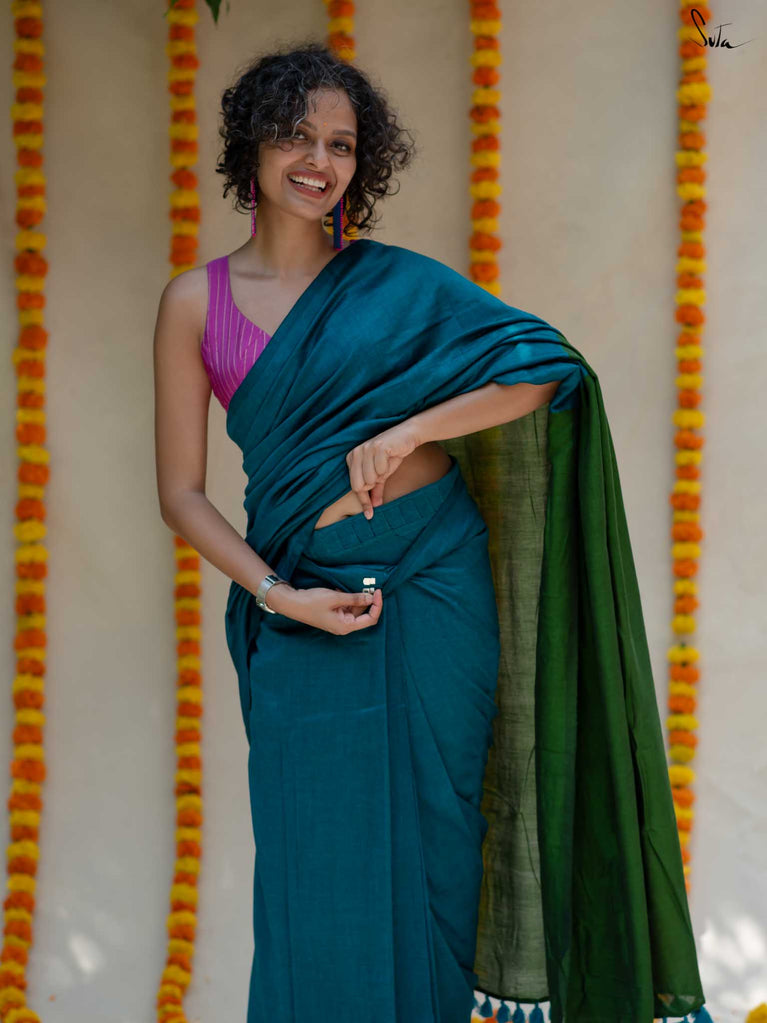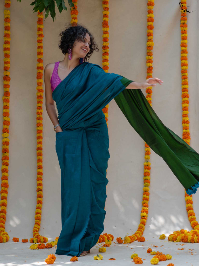 Celebrate color and craftsmanship with Dipped in Mulberry, a cotton-acrylic saree in a bold green-and-blue half-and-half design. A subtle zari stripe runs through the center, adding a touch of shimmer that elevates the saree’s festive charm. Woven carefully, it strikes the perfect balance between elegance and vibrancy - ideal for weddings, celebrations, or any occasion that calls for a statement drape.