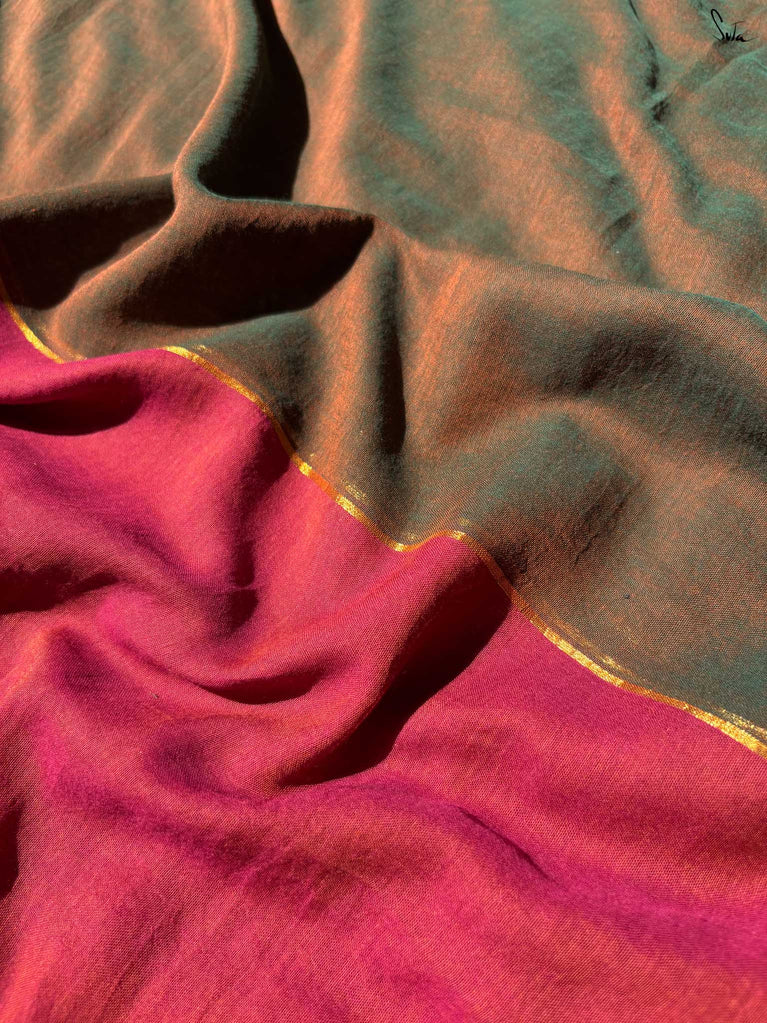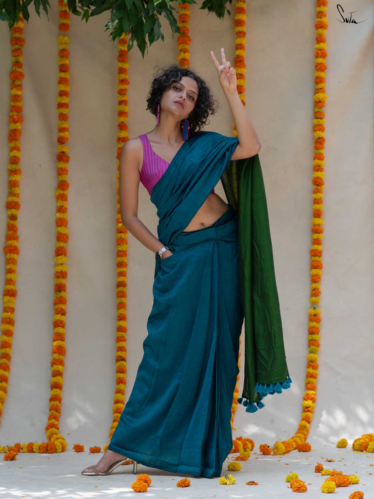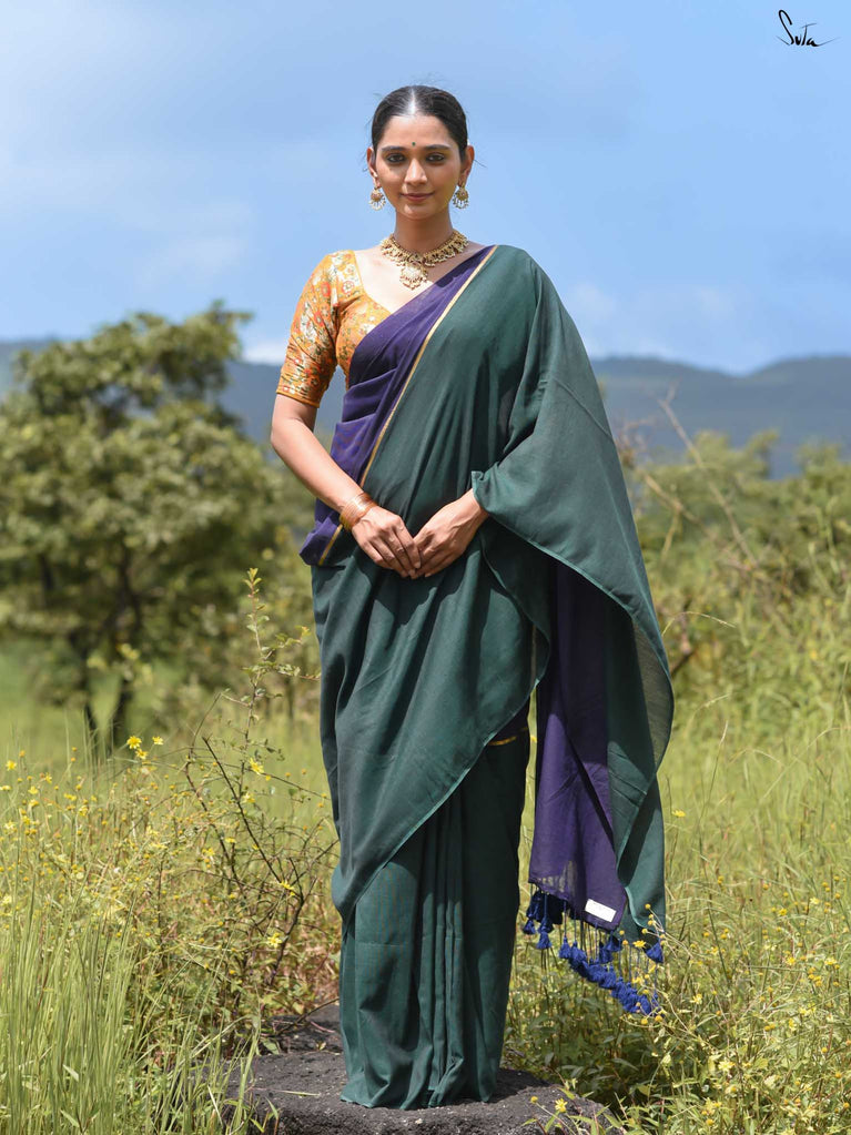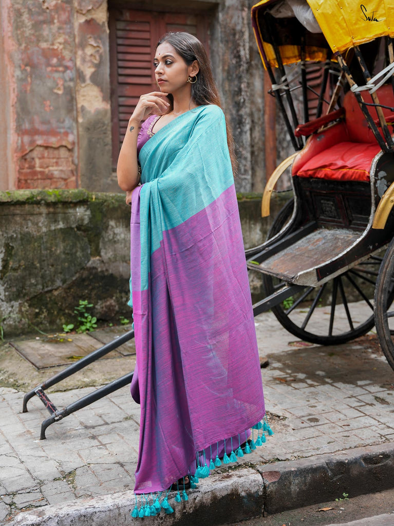 Celebrate color and craftsmanship with Dipped in Mulberry, a cotton-acrylic saree in a bold green-and-blue half-and-half design. A subtle zari stripe runs through the center, adding a touch of shimmer that elevates the saree’s festive charm. Woven carefully, it strikes the perfect balance between elegance and vibrancy - ideal for weddings, celebrations, or any occasion that calls for a statement drape.