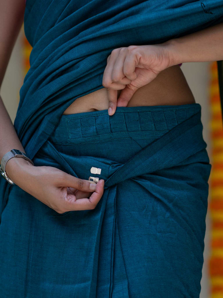 Aurum, a golden masterpiece, is made from opulent chanderi cotton silk. This saree is complemented by a matching lining that eliminates the need for an underskirt, while adjustable loops and a chic pocket provide comfort and ease. Ready to shine in under 30 seconds, Aurum is perfect for any occasion.