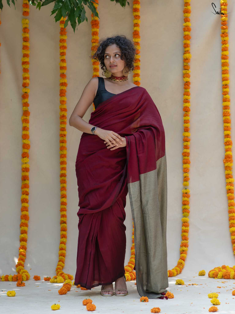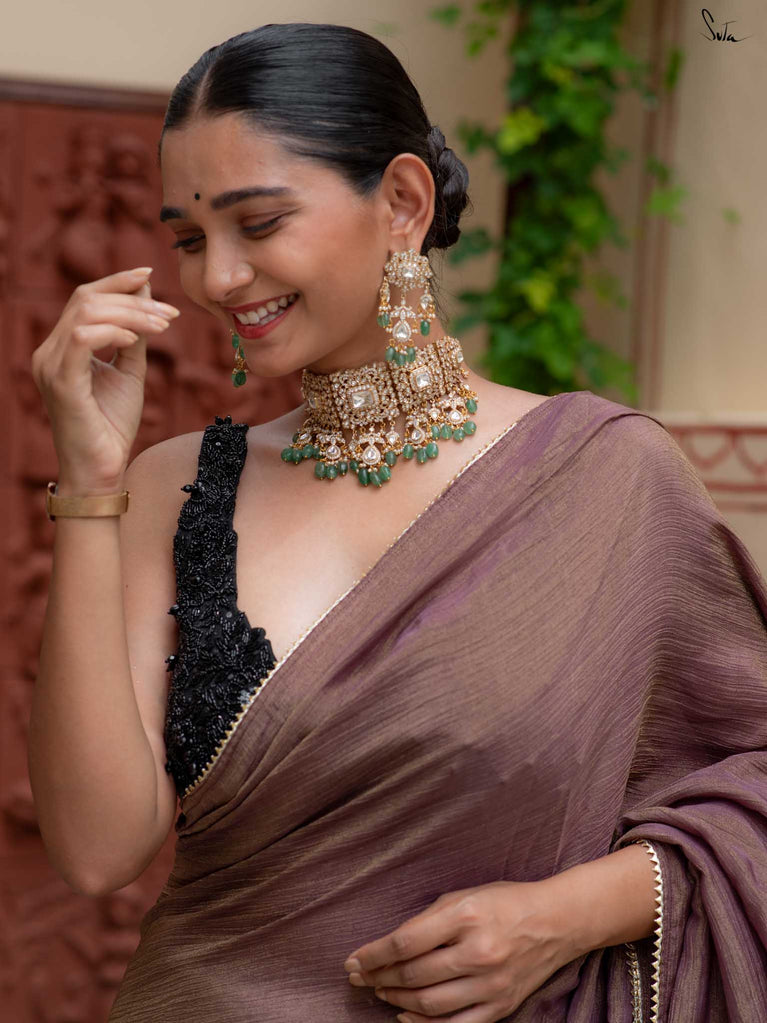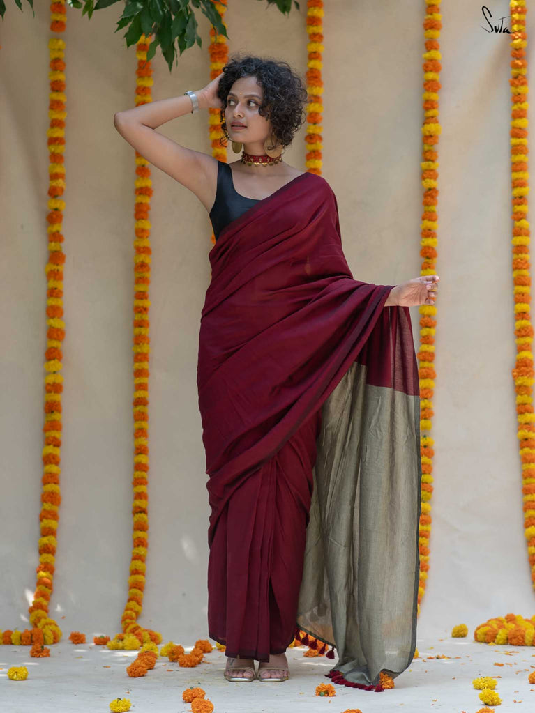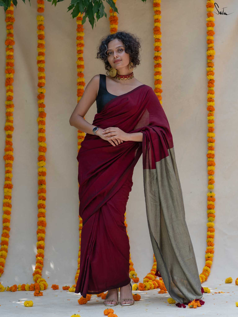 A glass of bold poured into the fabric. This wine crushed viscose saree is rich, moody, and unapologetically dramatic. Contrast tassels and a streak of gota at the border add that intoxicating flash of glam.