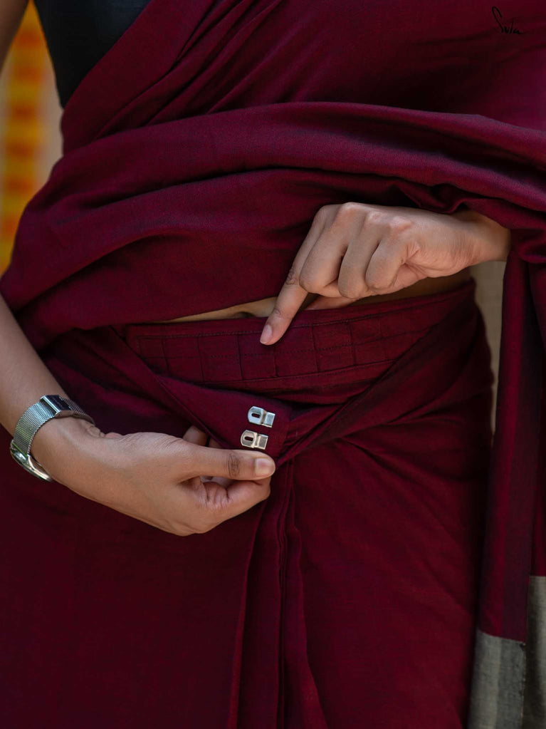 Inspired by the refreshing summer rains, Aruvi is a delicate mul cotton saree in off-white. The green and maroon border adds a splash of color, while matching tassels bring a quirky charm. Designed with built-in lining, pocket, and adjustable loops, Aruvi offers effortless elegance, ready to wear in under 30 seconds, without the need for an underskirt.