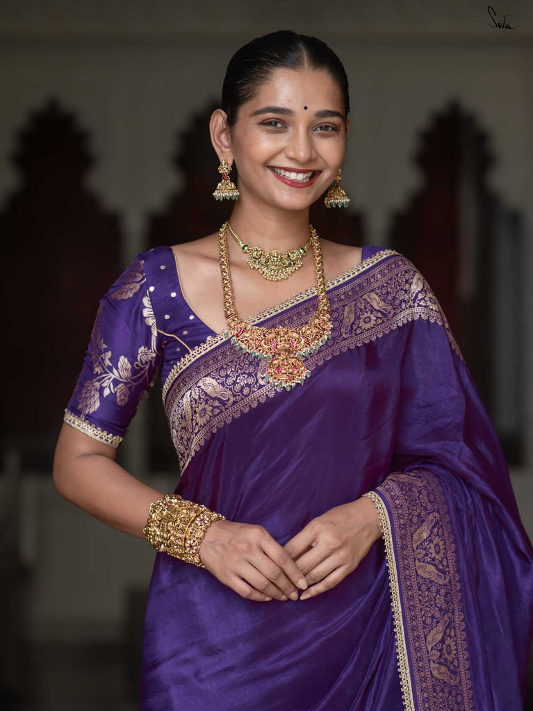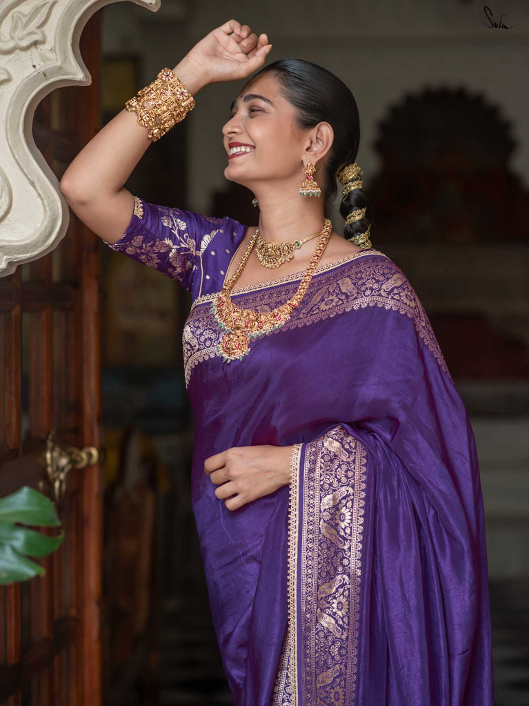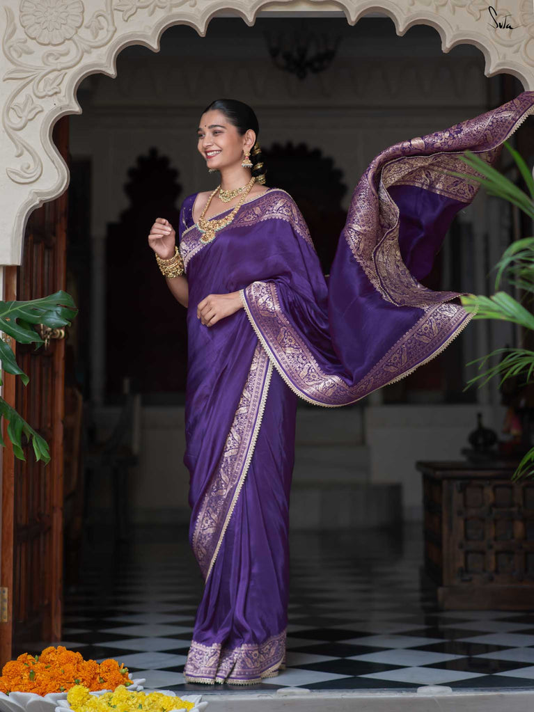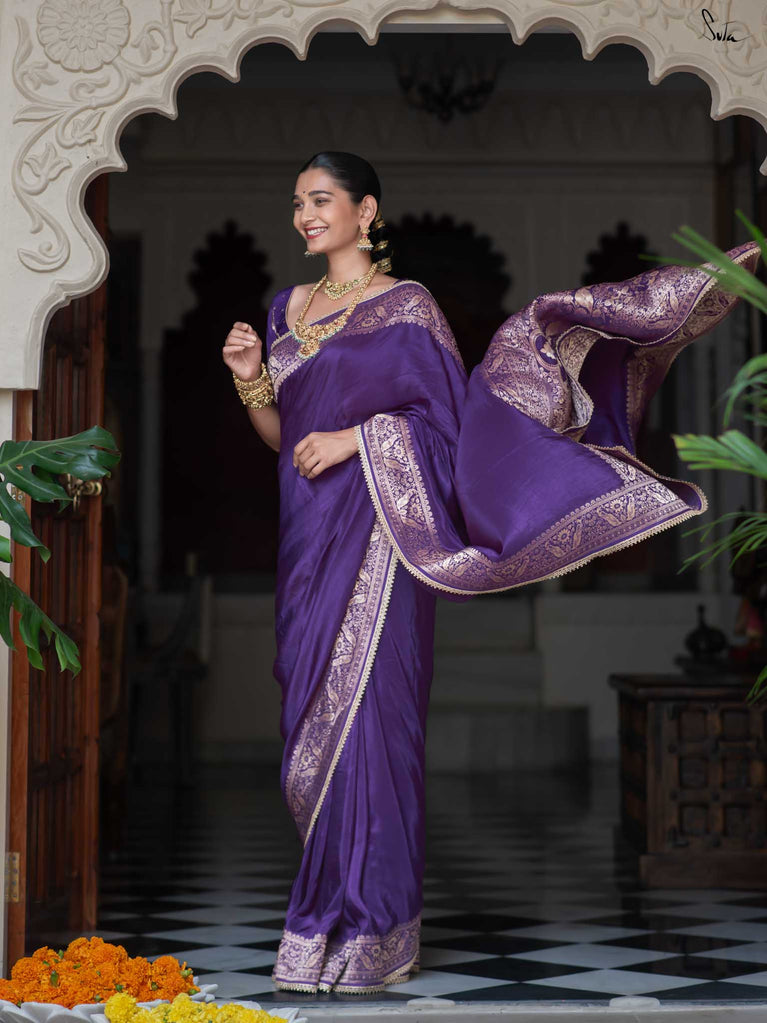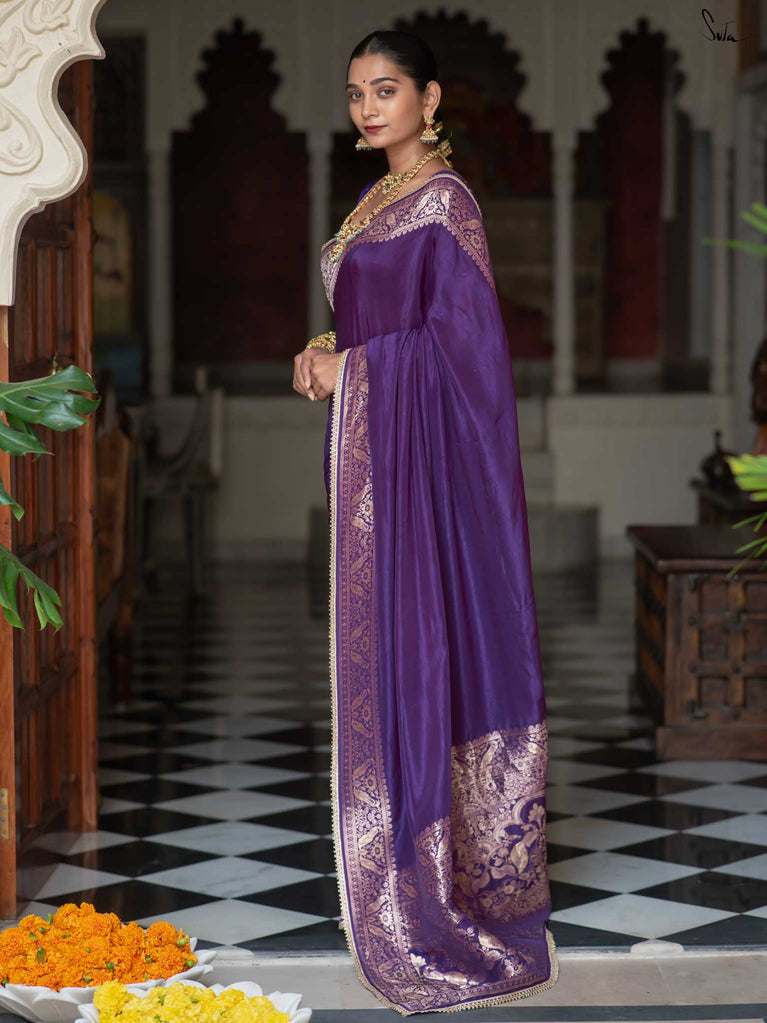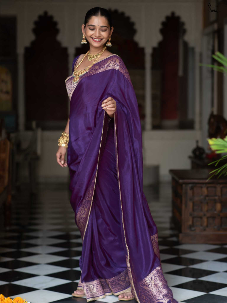 Turn heads at every evening celebration with Cocktail Hai, a regal purple viscose saree. Its smooth woven solid base is enhanced with delicate embroidered lace & brocade borders, creating a look that’s perfect for cocktail parties, wedding receptions, Cocktail evenings, and festive gatherings.A saree that balances sophistication with a hint of playfulness, ideal for celebrations where style meets elegance.