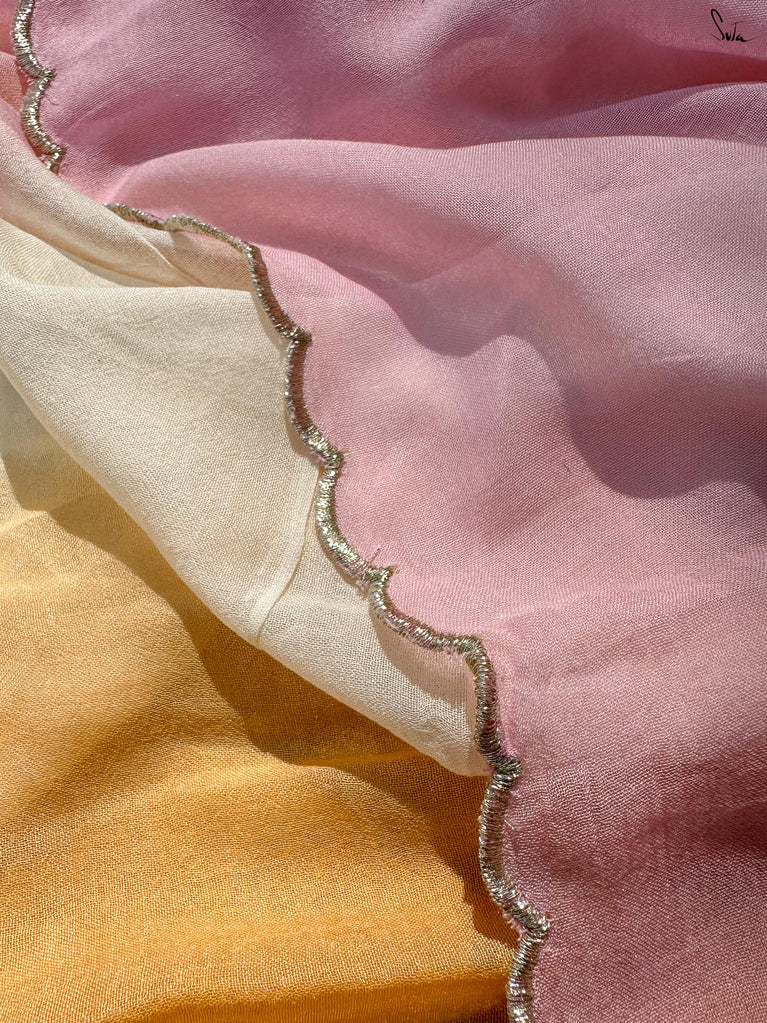 Light as air and translucent like a rainbow, organza silk is a fabric that exudes delicate grandeur. Woven with twisted silk yarn on the warp as well as the weft, this fabric is hailed for its slight transparency and its slightly stiff and yet fluid texture. The slight sheen adds to its charisma, making it the perfect saree to drape for both festive and formal occasions.