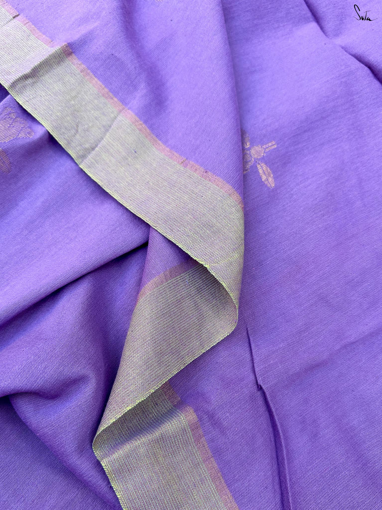 Inspired by the first ray of dawn, Dancing Dhoop makes you dance with joy. This Purple and magenta mul cotton saree brings two bright moods in one soft drape.Woven zari lines grace the pallu, while orange accents add a playful charm to the saree. Pink and purple tassels at the edges bring a touch of cheer. This piece is perfect for breezy brunches and carefree evenings.
