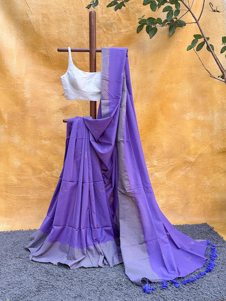 This gorgeous made-in-heaven mul cotton saree in purple with pink tassels and beautiful Ghicha lines on the pallu and zari border is enough in itself to make a stunning statement!