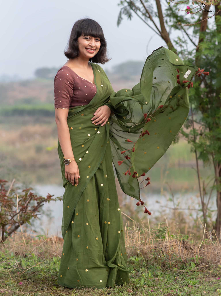 The made-in-heaven mul sarees from your wishlist just got dreamier now with the glitter of stars! The process of how they are made is also as endearing as the saree itself. Once we receive the made-in-heaven mul sarees and get a quality check done, these are sent to our superwomen. These women, after finishing household chores and other work for the day, sit together and stitch every single glitter on the saree by hand as Ravindra Sangeeth plays in the background. It takes 3 days to stitch the glitters, after which they make the tassels. Every bit of their joy and love is carried by the saree to reach you!