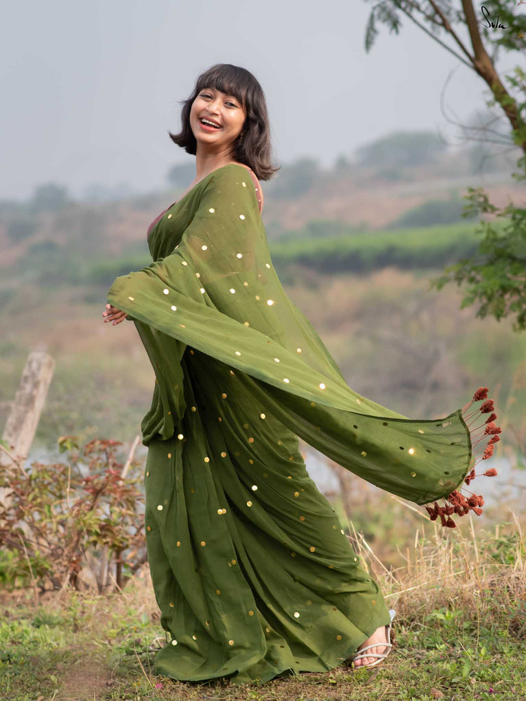 A blend of nature’s calm and vibrant charm, this green mul cotton saree is a breath of fresh air. With a delicate pink border that adds a playful yet sophisticated touch, it’s the perfect harmony of elegance and ease. Designed to wrap you in comfort, this ready-to-wear saree comes with a soft lining and a secret pocket, making it the ultimate fusion of style and practicality. Whether you're attending a day gathering or a casual celebration, Betul effortlessly brings grace to every occasion.