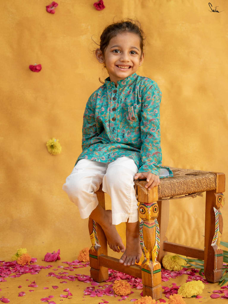 A song of colour and play, Bulbul is designed for the little gentlemen to shine. The kurta, in soft sushi voile, pairs lightness with festivity, while the cotton cambric pajama ensures all-day ease. The full-sleeve kurta features a cheerful digital print of flowers and birds, bringing a playful touch to traditional wear. A front button opening makes it easy to slip on, and side pockets add a practical twist for little treasures. The crisp white pajama pants come with an elasticated waistband and side pockets, perfect for morning aartis to evening fun.
