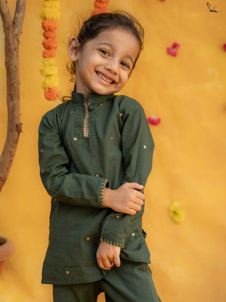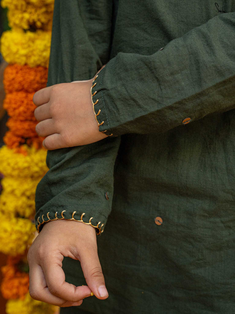 A festive classic for little gentlemen, Aamli is crafted in soft, breathable cotton cambric. The lush green, full-sleeve kurta with delicate chumki shimmer brings just the right festive magic. A front button opening makes dressing easy, and side pockets hold tiny treasures. The matching pajama pants feature cotton cambric comfort, an elasticated waistband, and side pockets for all-day ease, perfect for pujas, family gatherings, or joyful play.