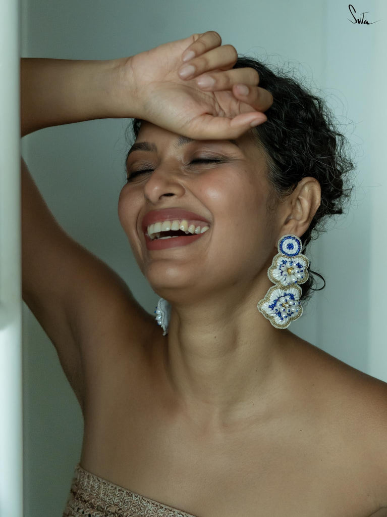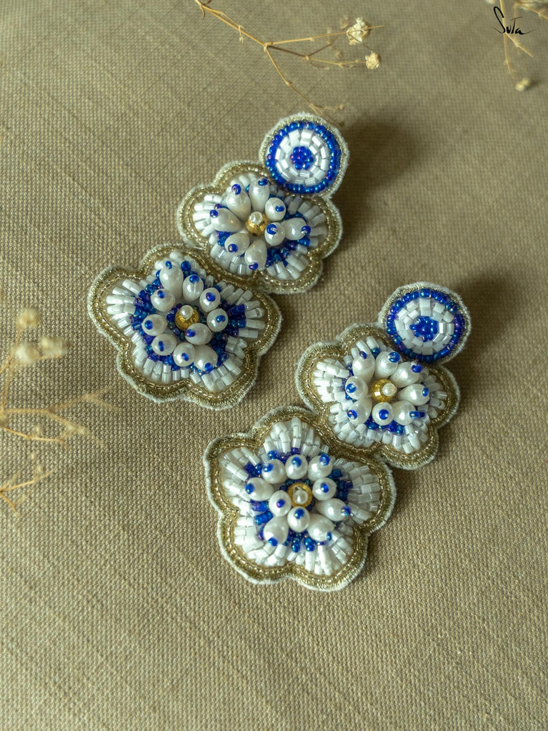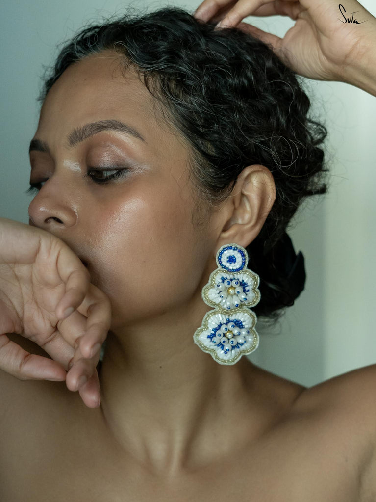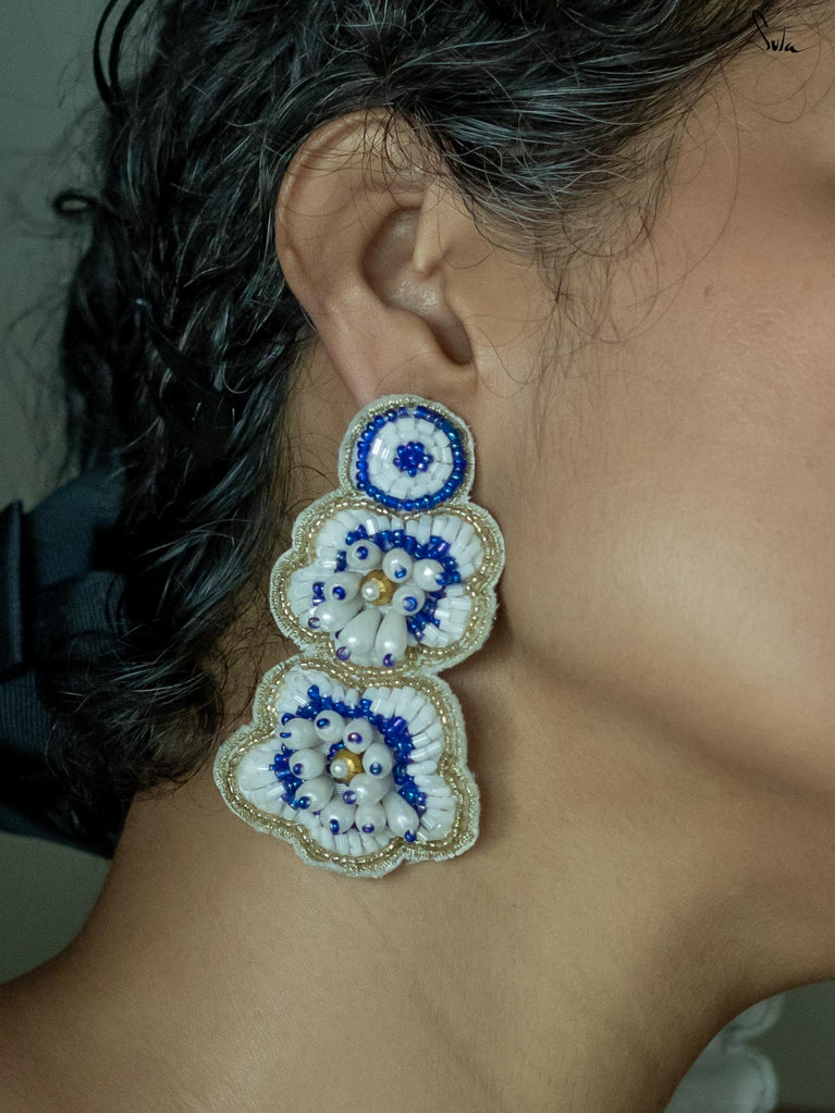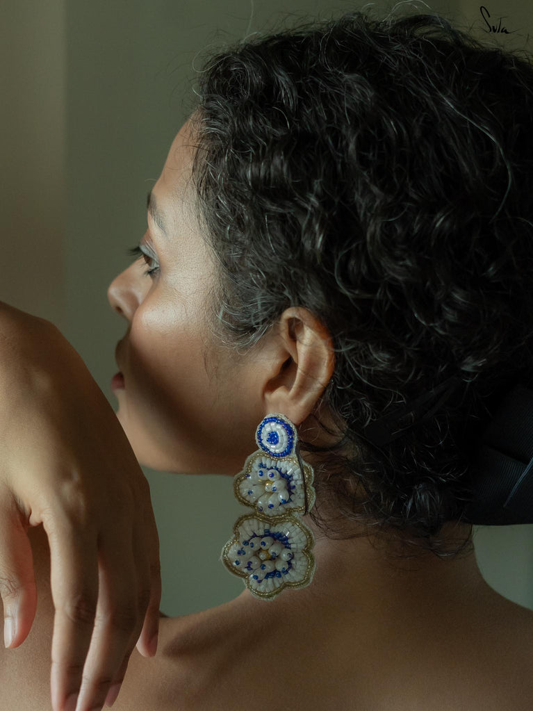 Sparkle and shine with the sparkling ECLAT ear ring, a pair of handcrafted floral earrings adorned in white and blue shades. Featuring zardosi threadwork all over the body, these hand-embroidered pieces transform every simple look into a glamorous ensemble.