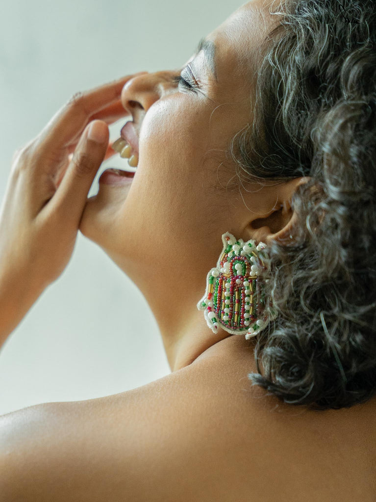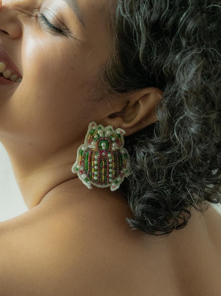 Immerse yourself in the beauty of the stunning Flambeau earring, an insect-shaped, funky piece of art. These handcrafted earrings come in an ensemble of white, red, and pink colors, and feature hand-embroidered work all over, making it a statement piece to own, wear, and slay!