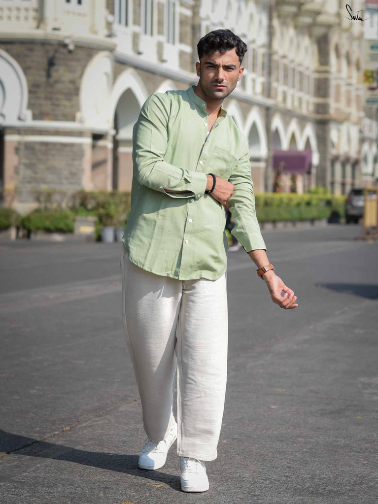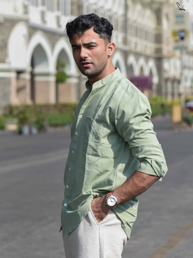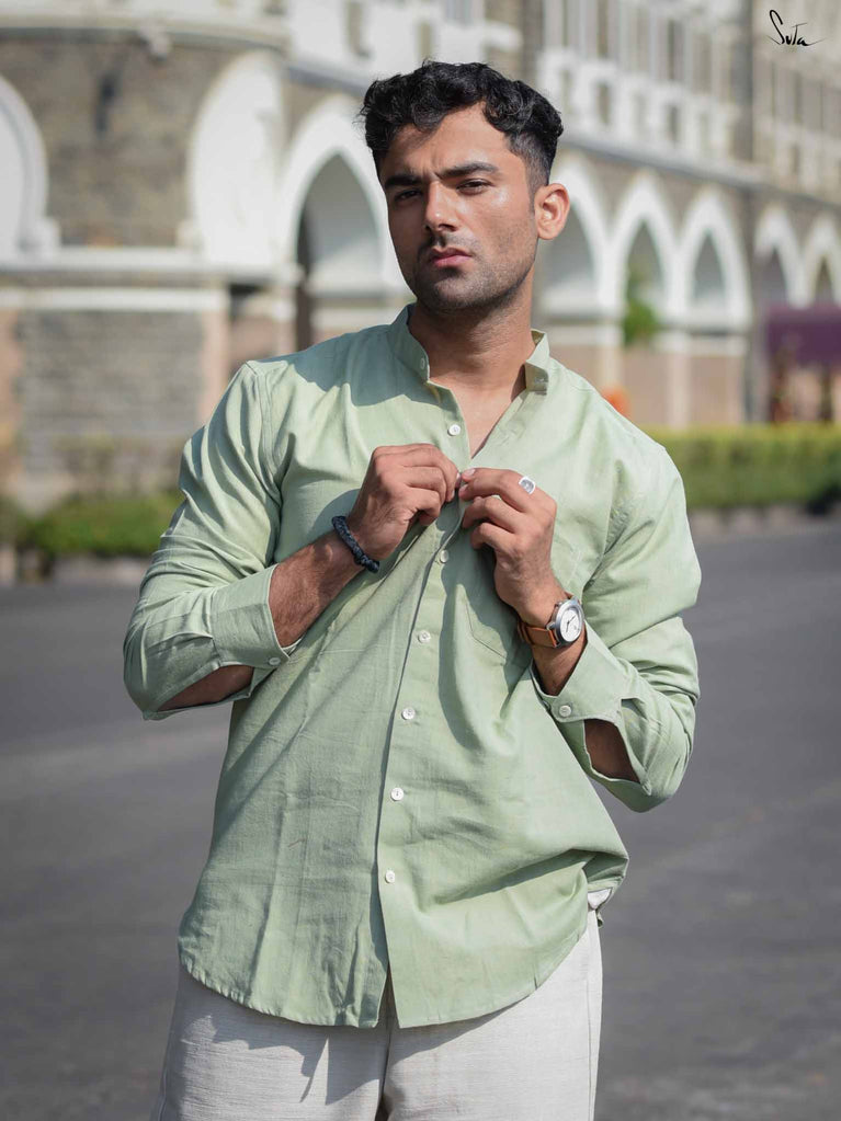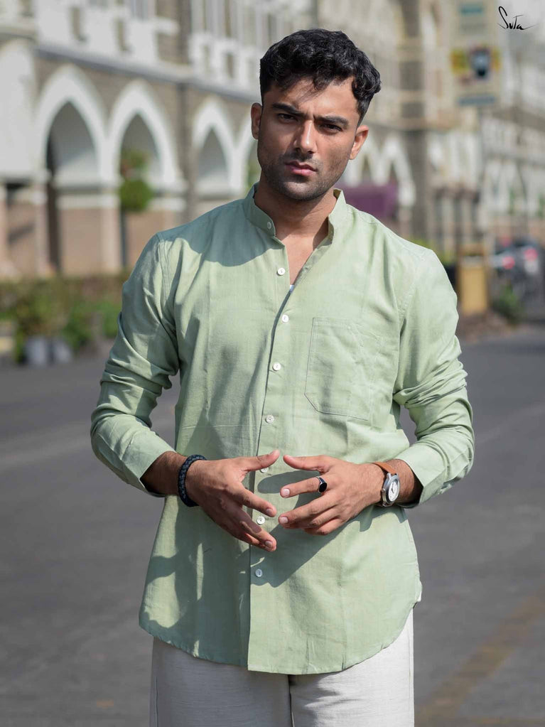 Discover your playful side with Faded Fern, a sage green shirt made from soft handloom cotton. This full-sleeve design features a quirky mandarin collar and a sleek front pocket, offering versatility for any occasion. Experience the effortless charm and unmatched comfort of Faded Fern.