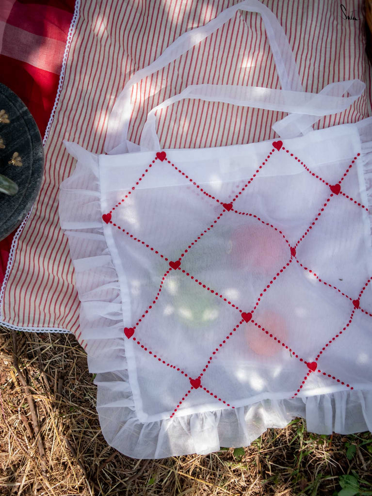 Dil Ki Baatein is a heartfelt tribute to the beauty found in life’s simplest joys. Crafted from organza, intricate embroidered crisscross checks and delicate ruffles dance across the surface of this bag, each detail a soft reminder of life’s tender moments. Whether you’re strolling through sun-kissed streets or meeting friends for a casual day out, Dil Ki Baatein will remind you that love and warmth are often found in the quietest, most unassuming places.