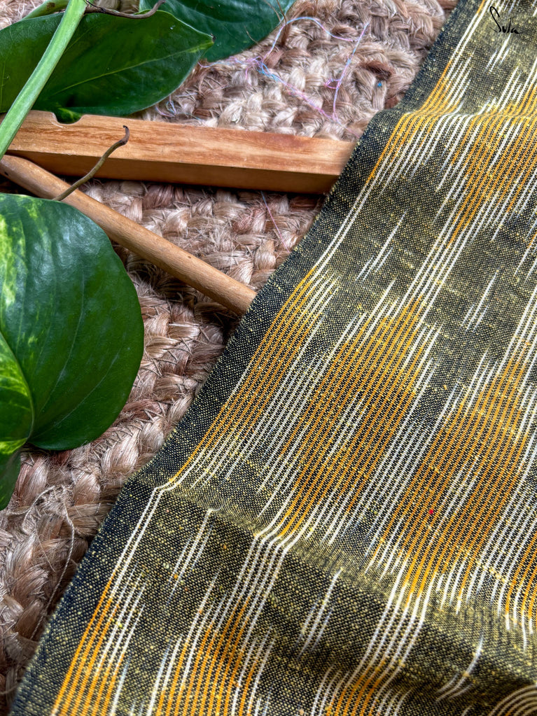 A yellow saree that feels like pure sunshine. The colour radiates warmth and optimism, lighting up every room you walk into. The geometric zari border adds structure and shimmer, keeping the look festive yet refined. Perfect for weddings and joyful celebrations. Comes with a matching blouse piece, no fall.