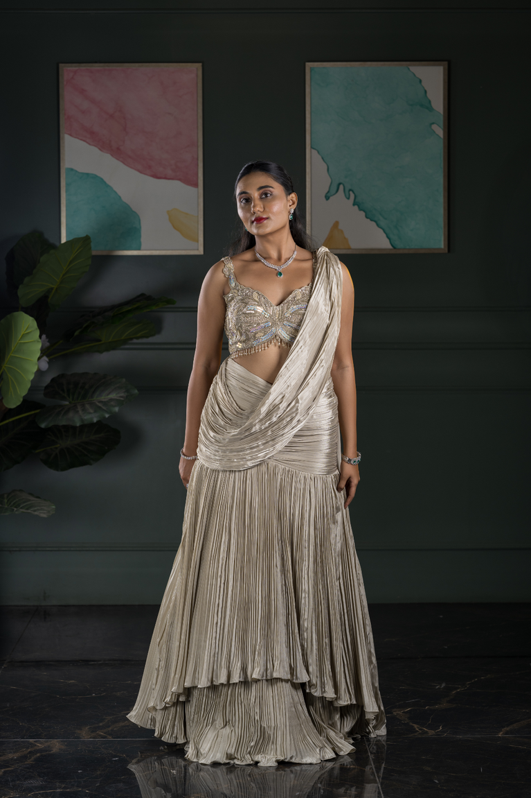 Shimmer in elegance with this soft gold organza saree, featuring a delicate scallop border and intricate hand gold cutdana work. Lightweight yet luxurious, it’s perfect for weddings, receptions, and festive evenings.