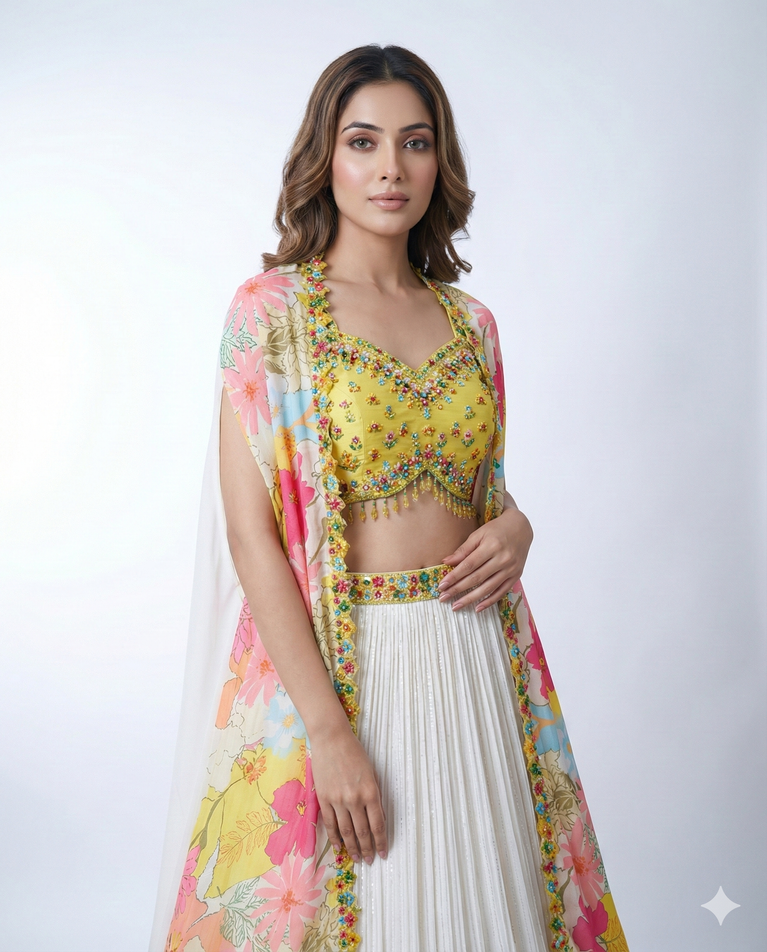 This colorful chinnon lehenga is beautifully highlighted with heavy sequin work all over, creating a vibrant and festive appeal. Paired with a striking yellow contrast blouse and a stylish printed cape, this ensemble blends contemporary design with celebratory elegance—perfect for sangeet nights, festive functions, and modern wedding events.