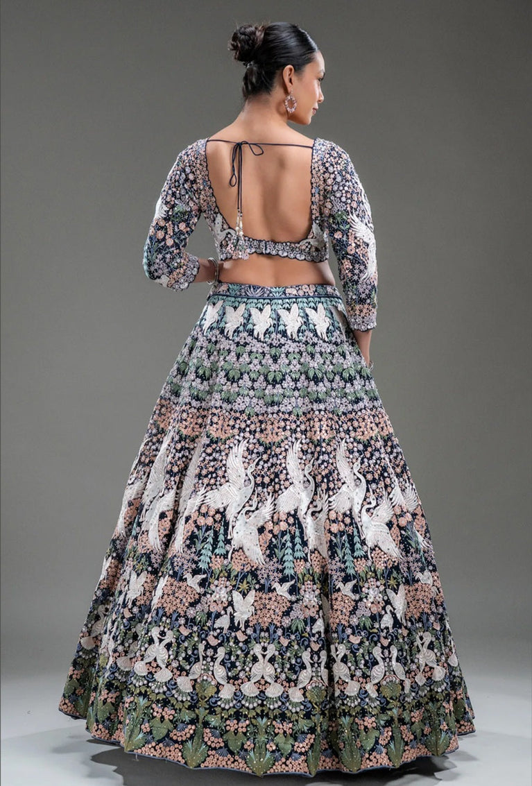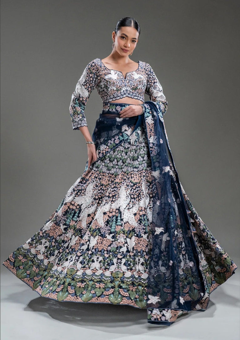 Make a statement in this blue net lehenga, beautifully detailed with white peacock motifs and intricate mixed jarkan embroidery. Finished with a heavy four-sided embellished dupatta, this ensemble blends regal charm with refined craftsmanship—perfect for weddings, receptions, and festive celebrations.