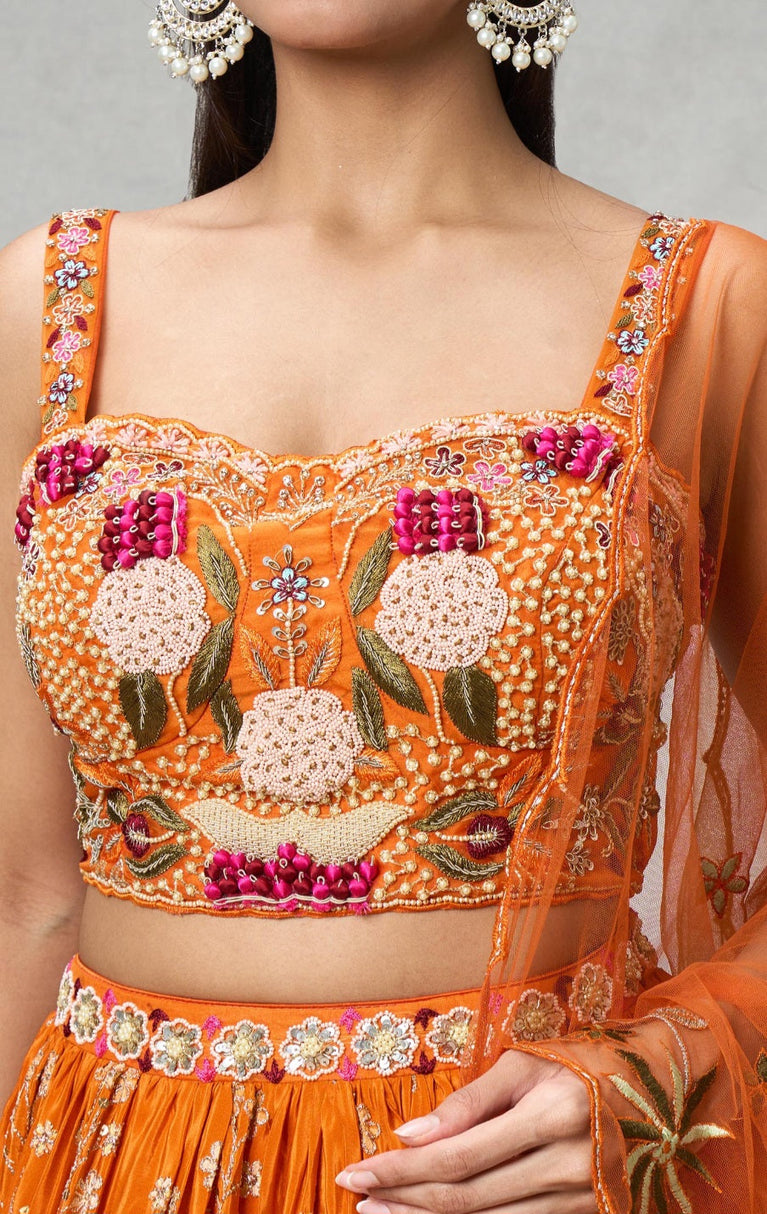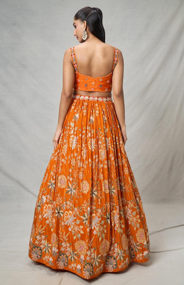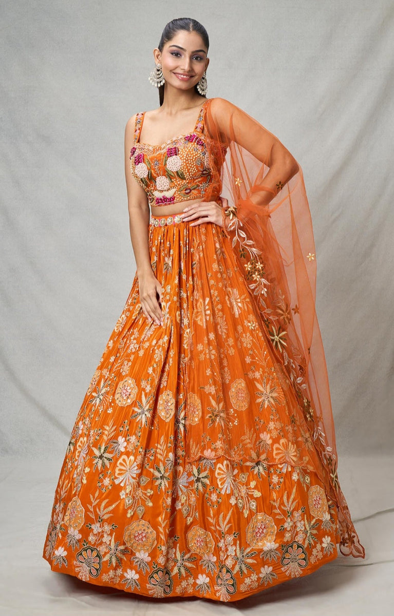 Orange Silk Lehenga with Floral Print & Hand-Thread Embroidery