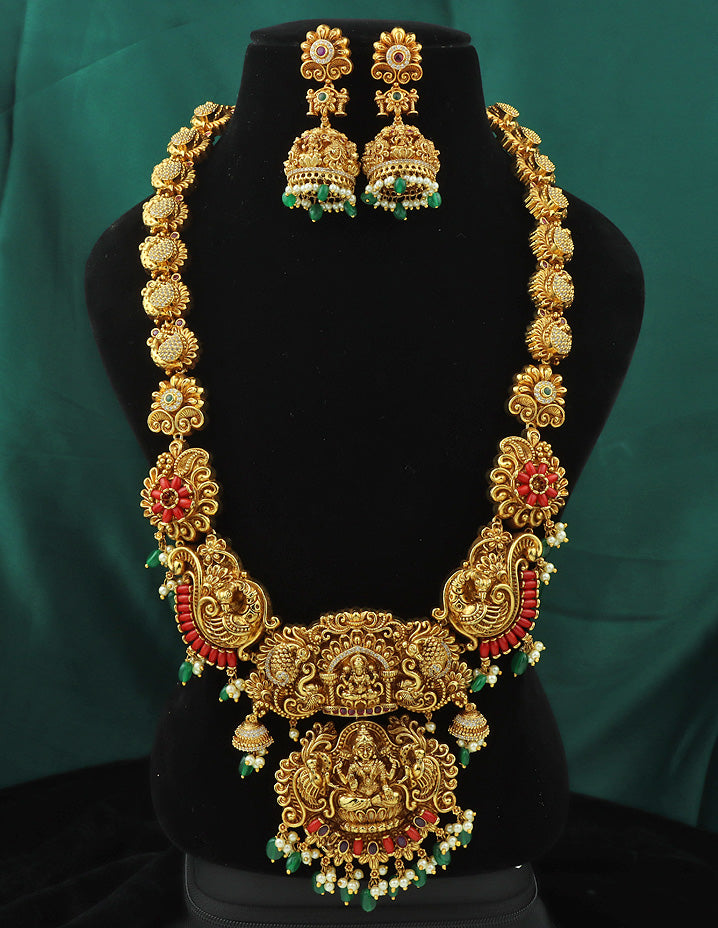 Elevate your traditional look with the Designer Matt Kempu Long Haaram Set, featuring intricate craftsmanship and vibrant red accents. The set includes matching Lakshmi Devi earrings, perfectly complementing the elegant haaram for a timeless appeal.