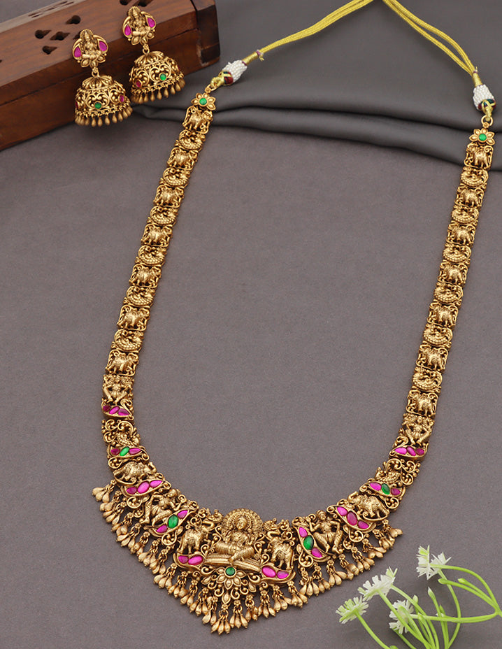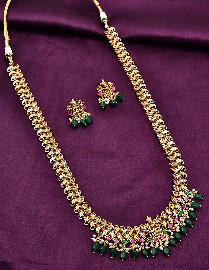 This Matt Gold Plated Kempu Long Haram Set, adorned with AD stones, is a celebration of timeless tradition. Paired with matching earrings, it’s the perfect pick to elevate your ethnic style with regal elegance.