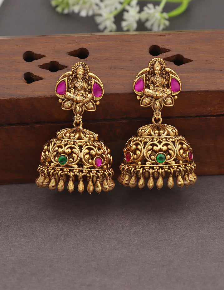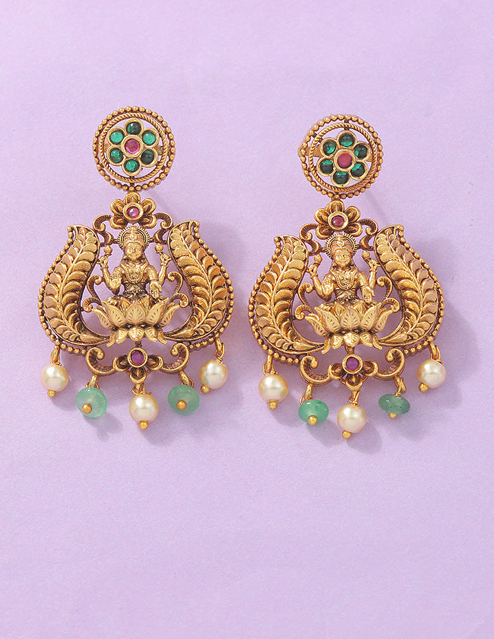This Matt Kempu Lakshmi Devi Long Haram Set, adorned with Rani Pink & Emerald stones and gold beads, adds a touch of traditional elegance.With matching earrings, it’s the perfect statement piece for any occasion, making a bold, eye-catching impact.