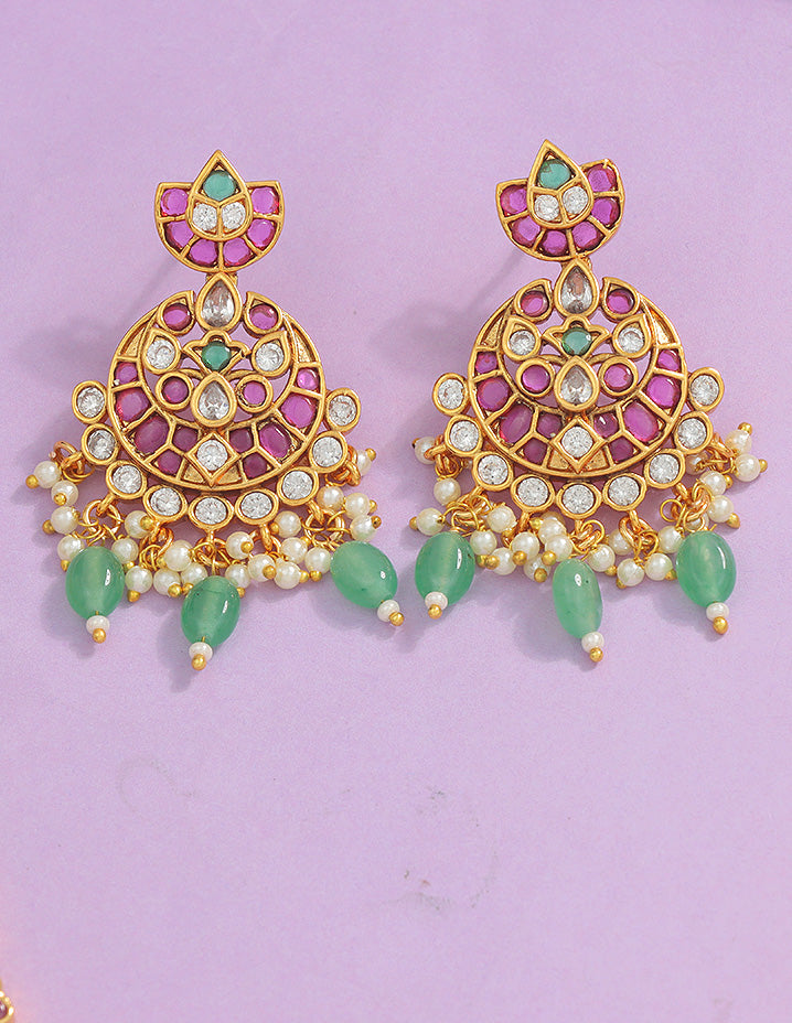This beautiful Gold Plated Long Haar Necklace Set is made of the highest quality metalwork and embroidered with dazzling Pink, Emerald & White American Diamonds. Paired with matching earrings set in traditional ethnic artwork, its perfect for any traditional occasion, and makes a bold style statement with its eye-catching desi looks.