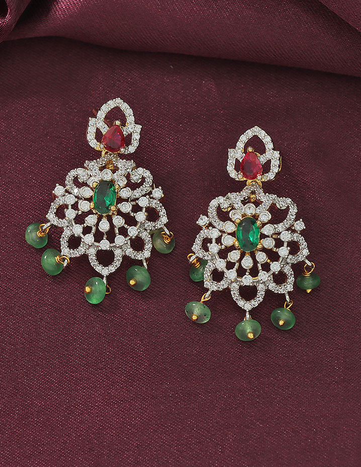 This beautiful aesthetic Zirconia necklace set right here is dripping in elegance and style. The traditional design of the necklace, studded in American diamond stones,Rubies and Emerald Stones beckons one to regal flair.