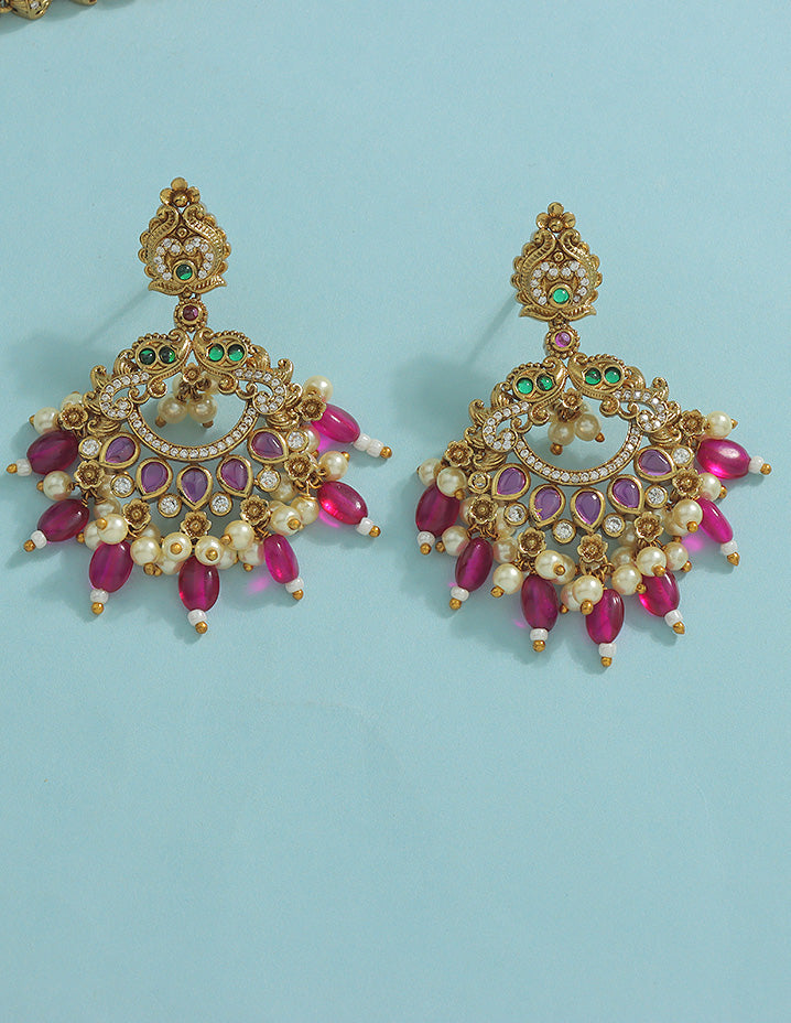 A majestic gold-toned necklace set adorned with ruby red stones, finished with delicate pearl clusters. Perfect for weddings and festive occasions, this regal set includes a matching pair of statement earrings to complete your traditional ensemble.