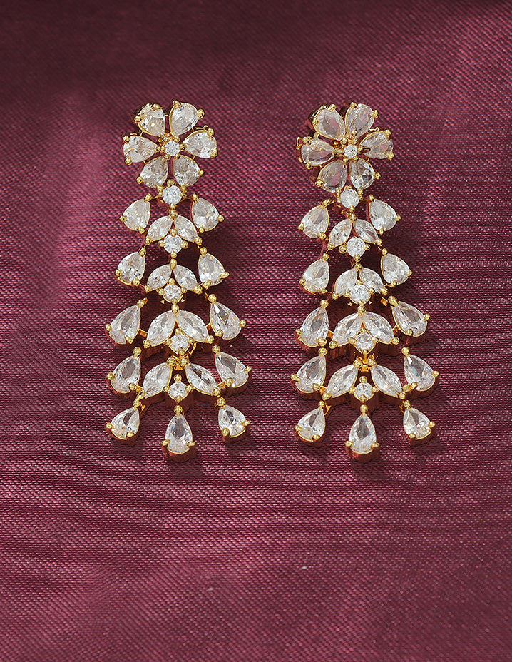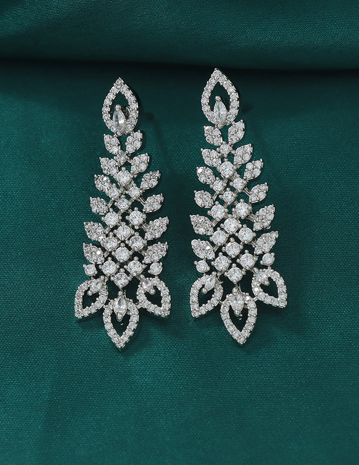 A radiant rhodium-toned necklace and earring set adorned with sparkling Bud and floral motifs, perfectly blending elegance and charm for your special occasions.