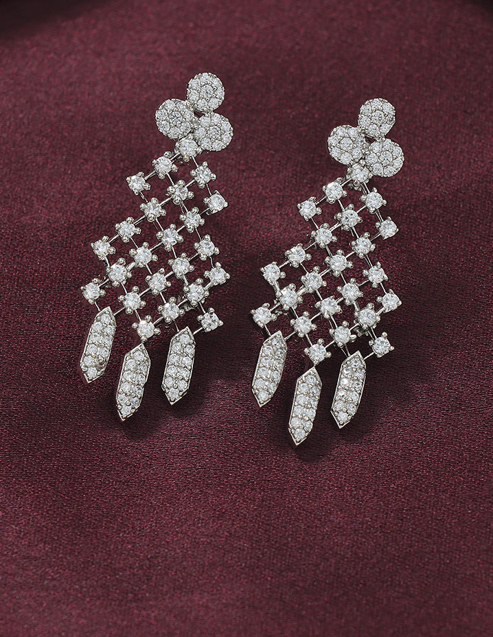This Designer Zirconia Elegance Necklace Set features sparkling white stones enhanced by a durable rhodium polish. Its refined craftsmanship adds a sophisticated glow to any ensemble.