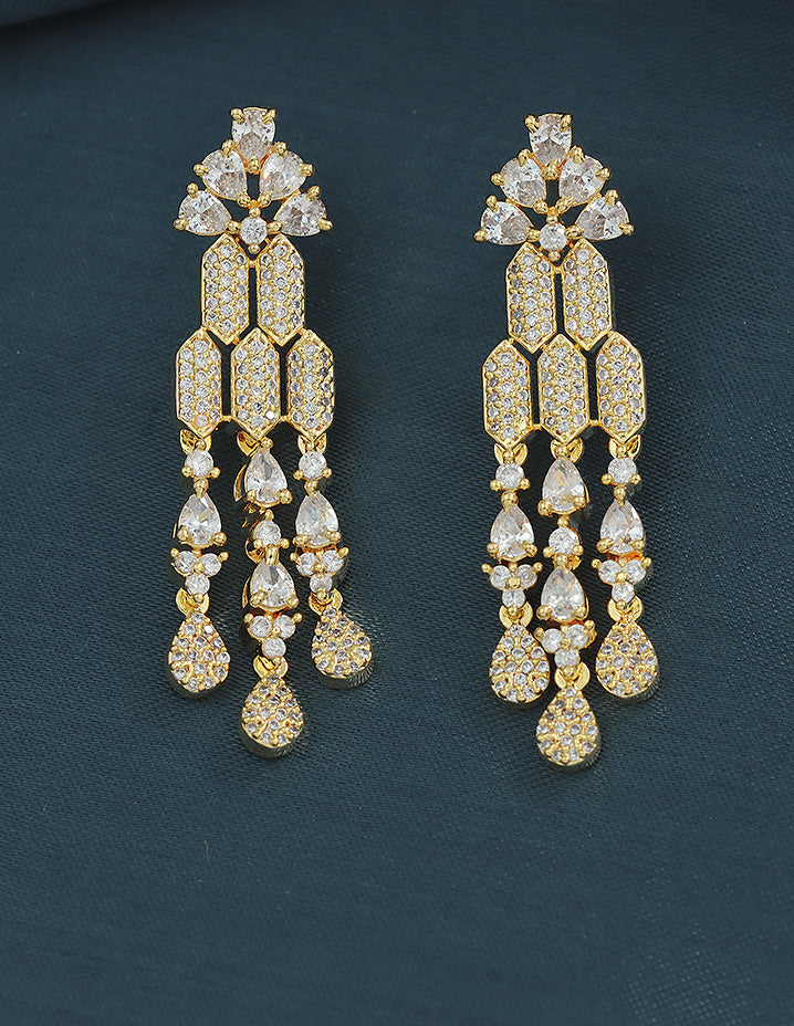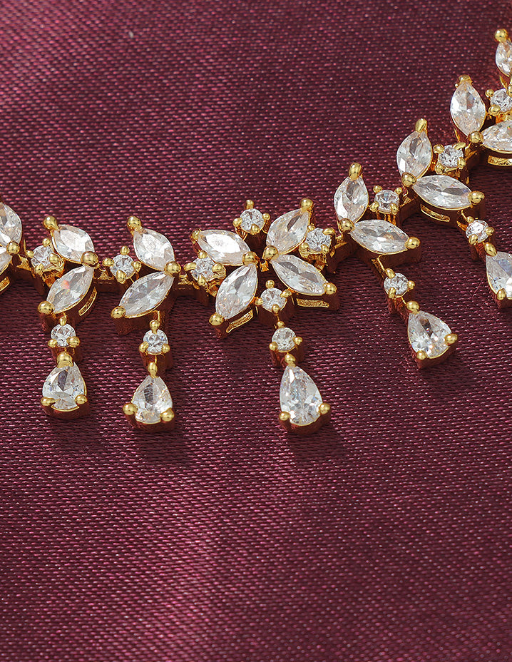 Elevate your style with this Designer Zirconia Elegance Necklace Set, featuring radiant white stones and a refined gold polish for timeless sophistication. Perfectly crafted to add a luxurious touch to any ensemble.