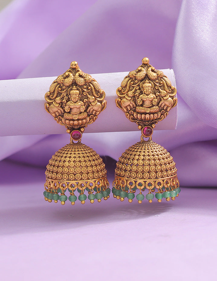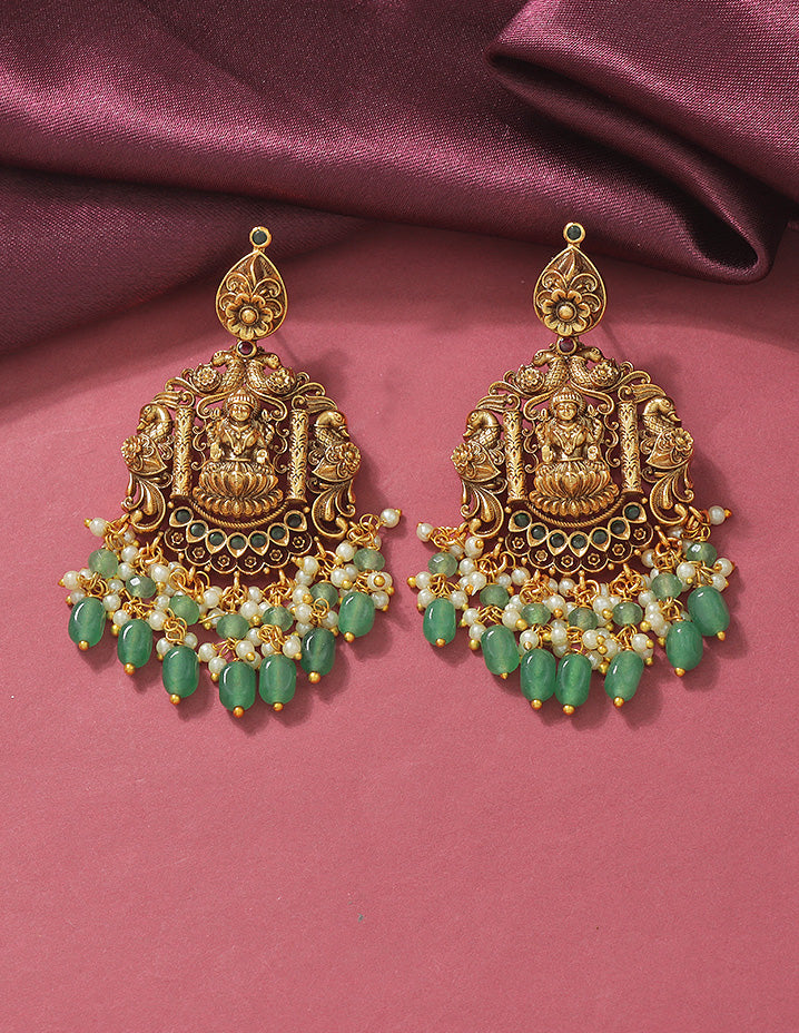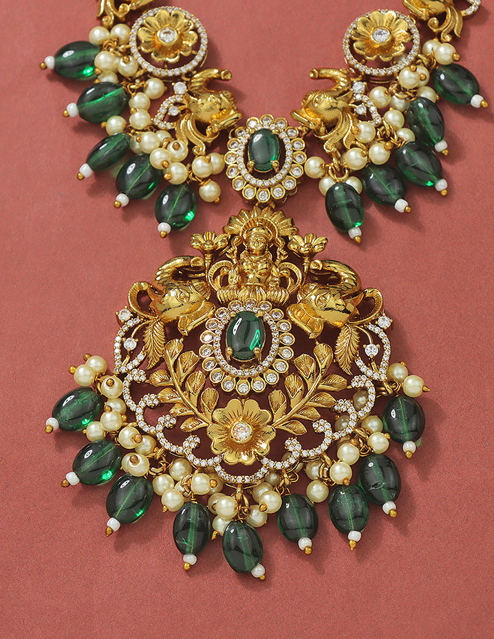 This Designer Lakshmi Devi Necklace Set features exquisite matt polish green beads, enhancing its traditional charm. Perfect for festive occasions, it blends intricate craftsmanship with spiritual symbolism, offering a sophisticated accessory that complements ethnic attire beautifully.