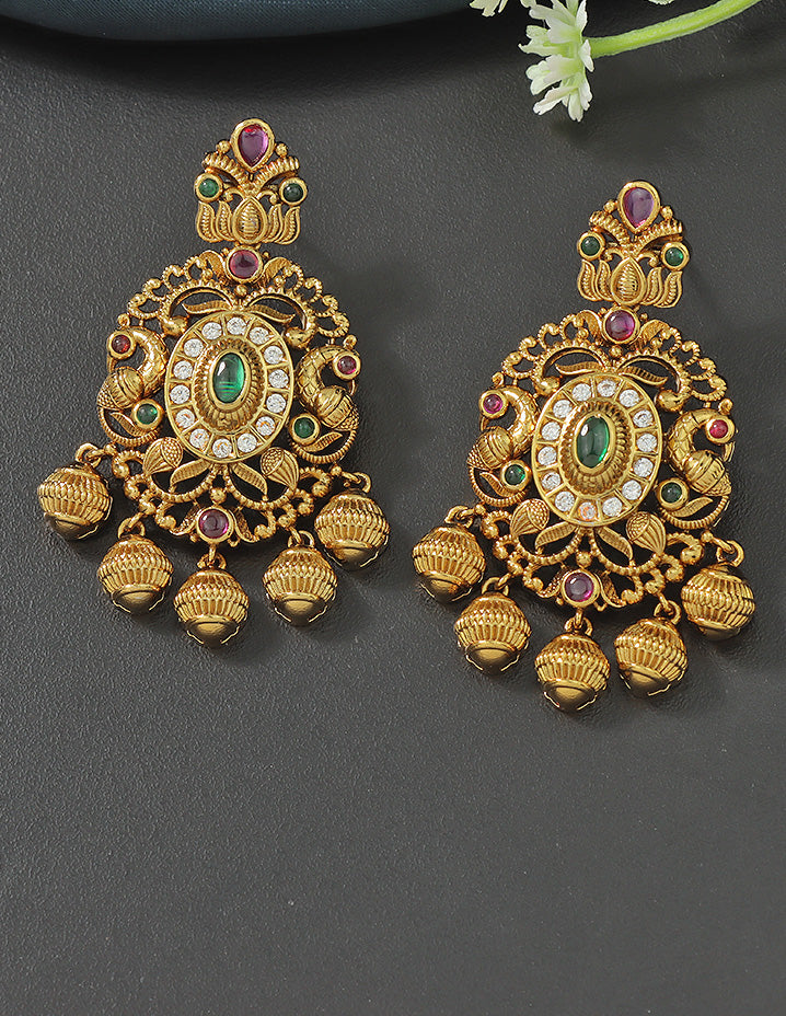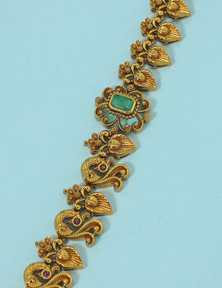 The Designer Matt Zirconia Necklace Set features a stunning peacock design, adorned with exquisite Ruby, Emerald, and white stones. Expertly crafted, this set is sure to elevate any outfit and make a bold statement. Experience luxury and elegance with this one-of-a-kind necklace set.