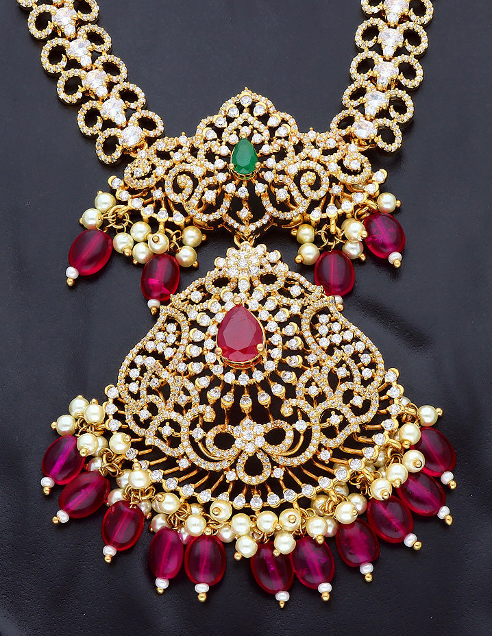 This beautiful Gold polish CZ necklace set right here is dripping in elegance and style. The eccentric design of the necklace, studded in American diamond stones, looks like a treat to the eyes.