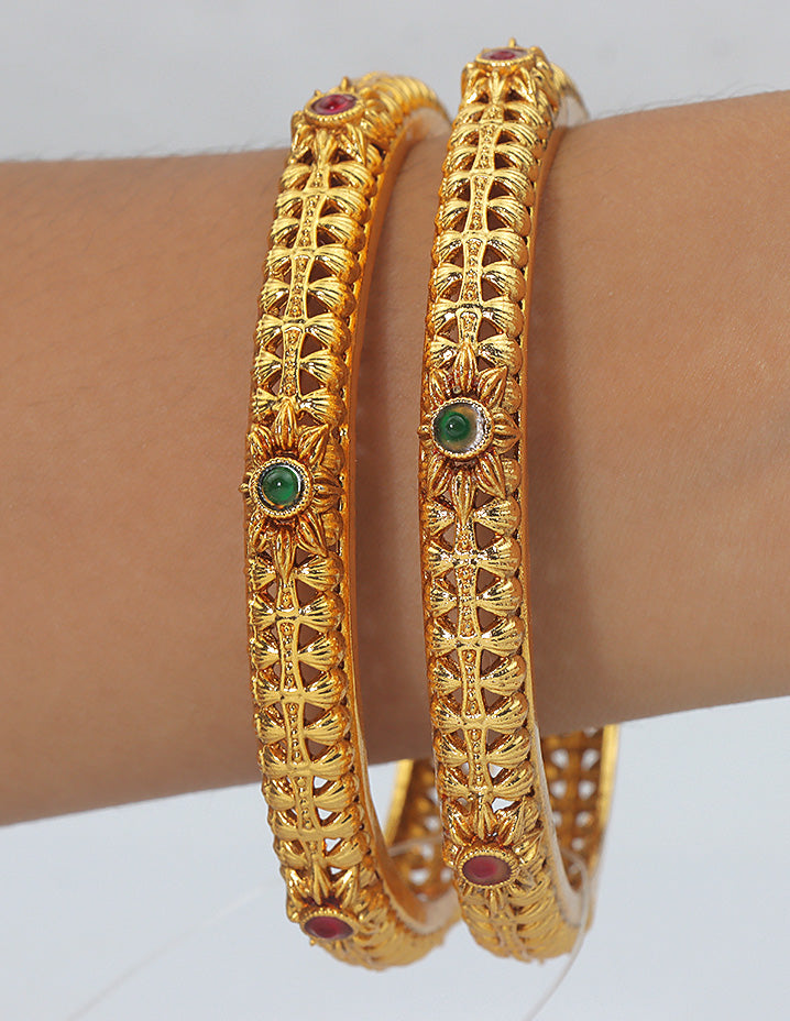 A stunning pair of gold-finish bangles adorned with intricate floral carvings and vibrant red and green stone accents—perfect for festive elegance or timeless tradition.